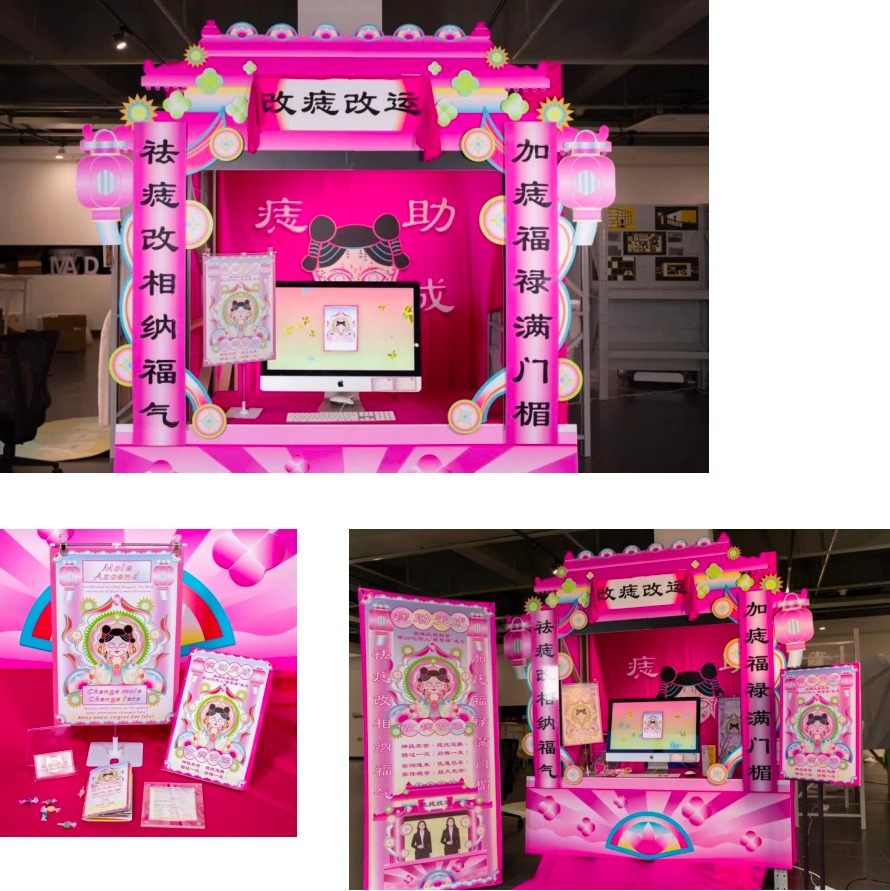 "MoleAscend" integrates mixed media and graphic design, simulating an agency that alters moles to change luck, exposing the absurdity of blind market behaviors. It presents the whole process through an interactive webpage and a real shop, aiming to awaken people's awareness of destiny autonomy.