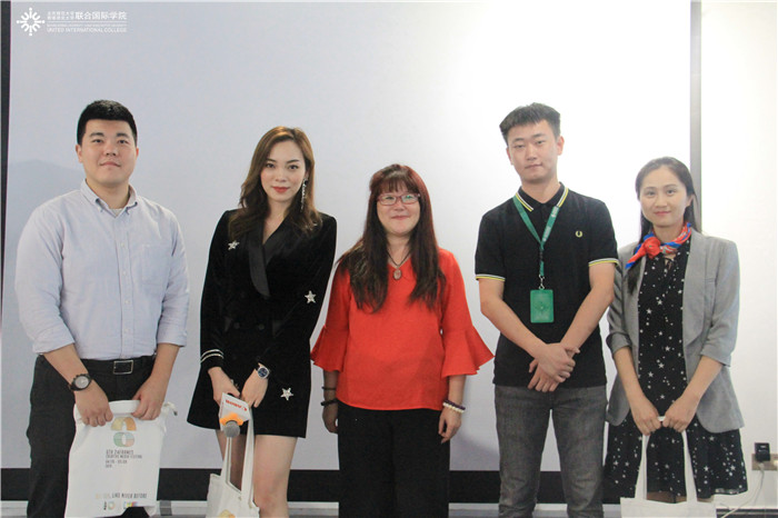 讲座现场,何洁(左二)与影视学课程主任麦莉娟教授(中)等合影