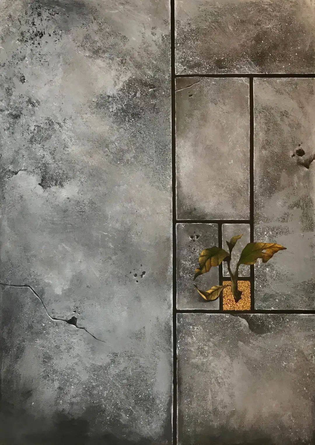 邝志文通过在画布上不断地建立与破坏空间、形状与色彩之间的关系,抽象剖析自我,“重复这个过程,直到不能再推进,达到内心的安静和平衡,才完结了这幅作品。”