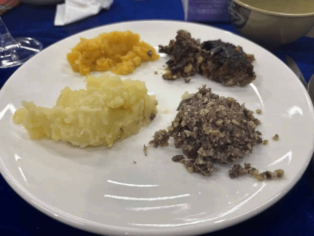 Haggis is not at all easy to find in China, it is a specialist Scottish dish that combines several meats with grains and spices. With a little effort and creativity we managed all the same and supplemented it with vegetarian haggis that was prepared especially for the occasion. Alongside these were served the two traditional sides of mashed potato and mashed swede. These too required some experimentation to find Chinese equivalents as swede is not grown in the same form in China. The final result was quite satisfactory and would not have been out of place on a dinner table in Edinburgh.