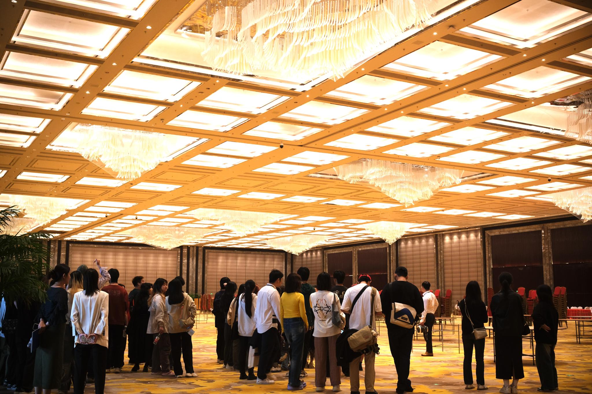 紧接着,同学们来到了会展中心二期参观。工作人员向大家介绍了会展中心一期与二期定位的不同。一期主要是助力横琴的大发展,承办综合性活动;二期主要是助力大湾区金融事业的发展,承办金融相关的会议活动。在会展中心二期,CCM同学们首先参观了华南区最大的宴会厅-大湾区厅。该厅承办了沃尔玛、立白等知名品牌的年会,可被灵活拆分成7个独立会议厅室,同时容纳3300人同时用餐。