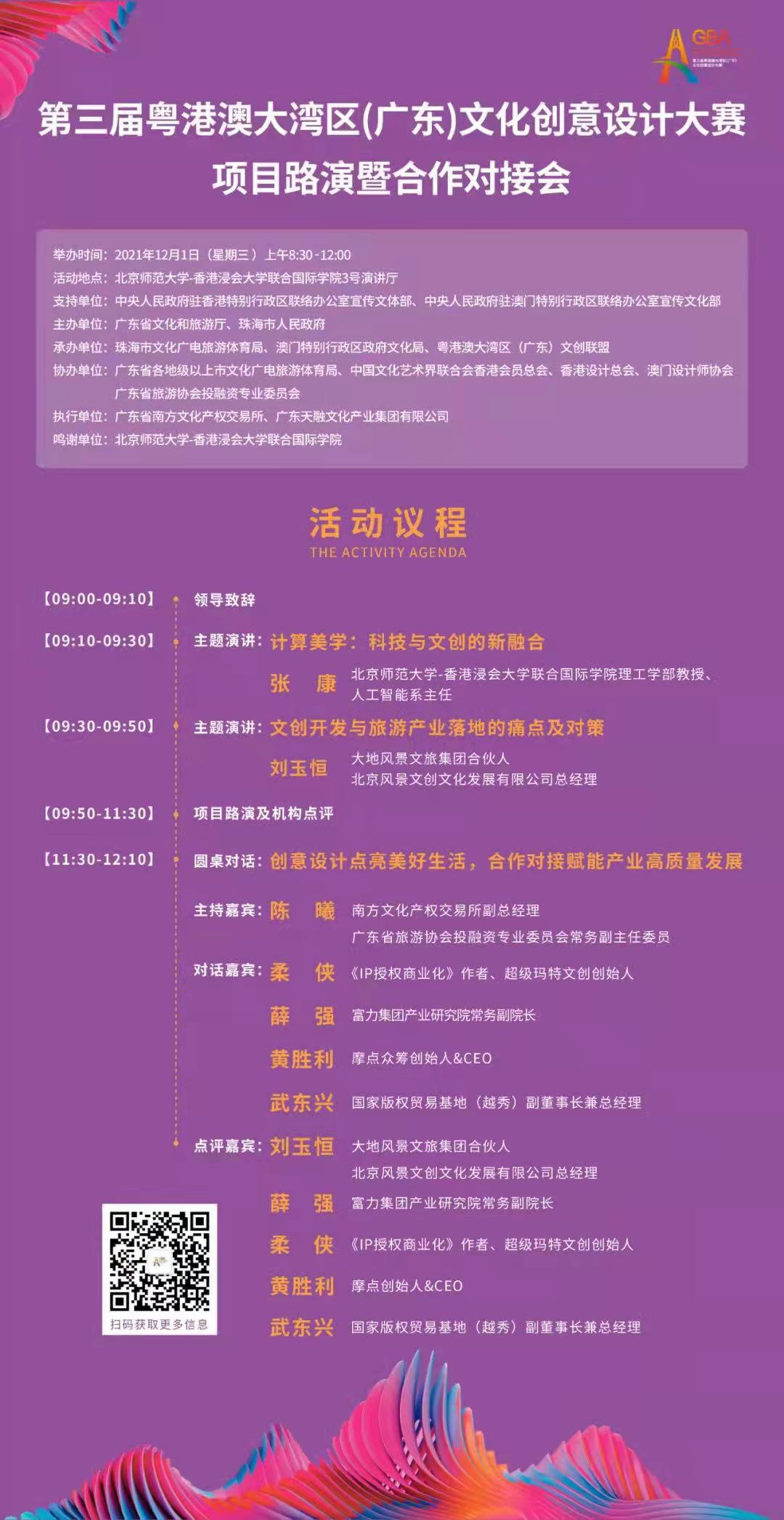 为着力构建粤港澳大湾区在文化创意领域的交流合作与资源共享平台,推动粤港澳大湾区文创产业协同发展,促进岭南文化创造性转化、创新性发展, 由广东省文化和旅游厅、珠海市人民政府主办,珠海市文化广电体育旅游局、粤港澳大湾区(广东)文创联盟承办的“第三届粤港澳大湾区(广东)文化创意设计大赛”在珠海举办。在此诚挚地邀请您参加在UIC举办的“第三届粤港澳大湾区(广东)文化创意设计大赛”项目路演暨合作对接会。