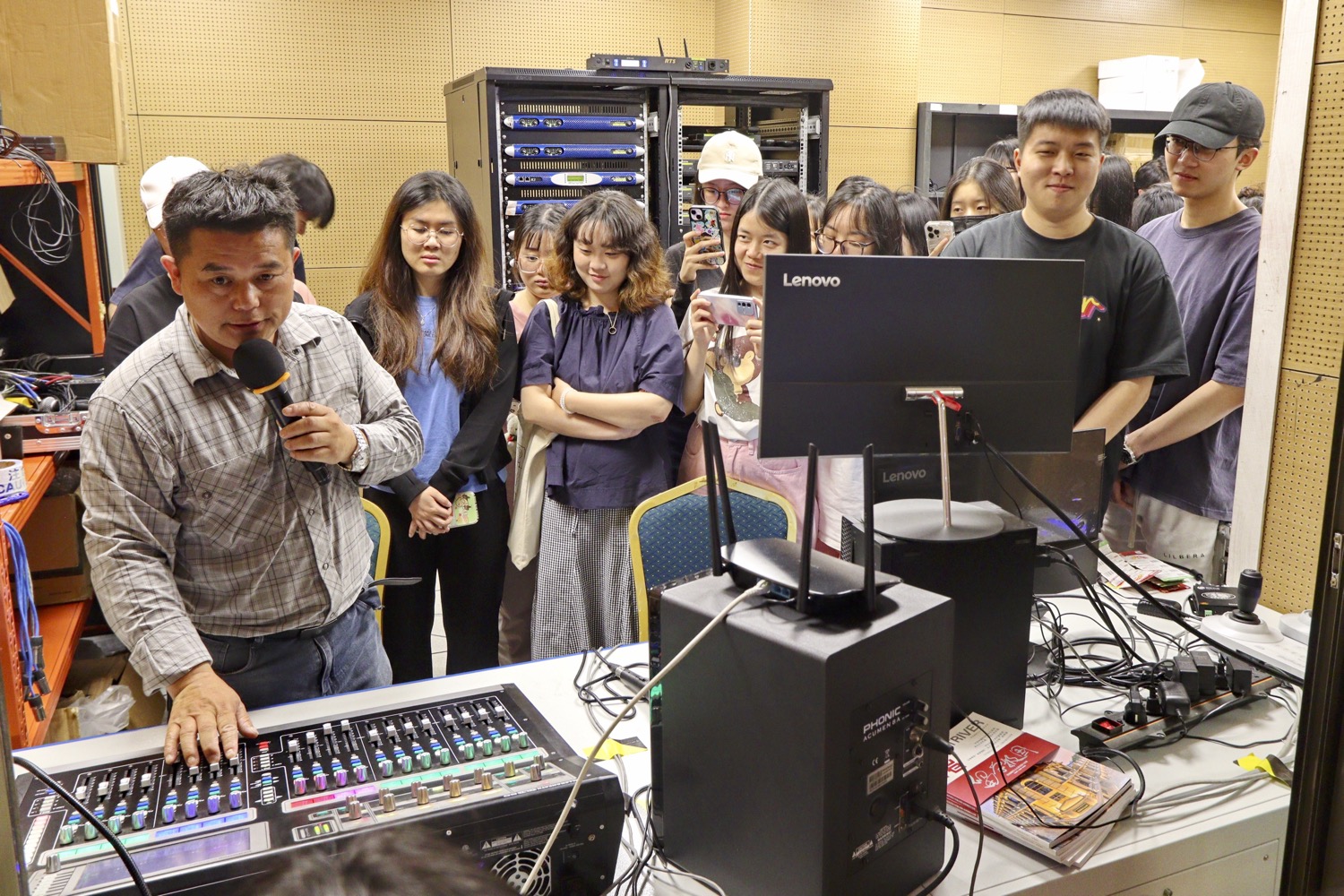 在控制室內,吴老师示范了灯光控制台和调音台的操作技巧,及礼堂的各种视听设备。学生还有机会操作这些设备,加深了他们对视听元素如何影响观众对舞台上表演者体验的理解。