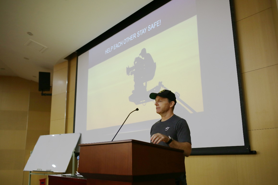 随后,Andrew老师分别就法律法规、用电安全、器材使用安全、打斗场面拍摄、枪械使用、玻璃制品使用、道具使用、烟雾火焰使用、交通、动物拍摄和未成年人拍摄法规等多个有可能出现安全隐患的方面结合丰富的案例和影片给同学们进行了安全知识的普及。他要求同学们必须时刻注意安全,把危害安全的系数降到最低的同时,能使作品呈现最大化的表现效果。
