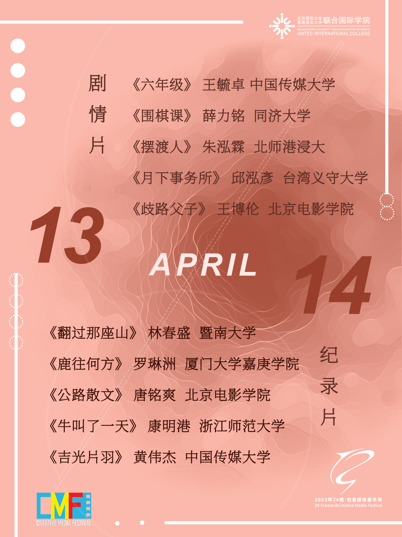 「24格·创意媒体嘉年华」组委会将在本周放映 2022年「24格·创意媒体嘉年华」入围竞赛影片,本单元的主题为「赤子」。 今年收到了来自两岸三地的两百余份投递影片,经过组委会和 CTV 各位老师及业界评委的三轮筛选,为大家精选出了 5 部纪录片,5 部剧情片。此次观影是一个与外校创作者交流的良好机会,现场亦设置了与影片主创团队的互动环节。 我们诚挚邀请大家前来观看,并一起投票选出“最受欢迎剧情片” & “最受欢迎纪录片”两个奖项。在线下放映的同时,我们将在 Bilibili 上同步直播,不能到场的各位可选择线上观看, 直播账号:24格创意媒体嘉年华(UID: 2064183376)