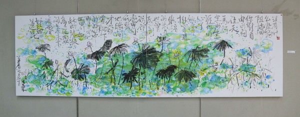 Andy Dadas 4.4 metre long Blue Lotus, an acrylic paint and ink on canvas, depicted the flowers experiences from birth to death. The lyrics of a Chinese song of the paintings namesake were written with a brush at the top of the painting. Dada explained that this song, composed by Chinas famous singer Xu Wei, inspired him in hard times.