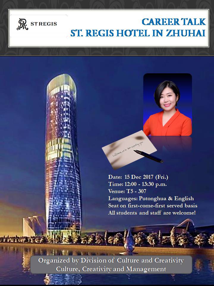 You are cordially invited to attend our Career Talk shared by Ms Fiona Jingjing HAN, the Director of Human Resources of St. Regis Hotel in Zhuhai.