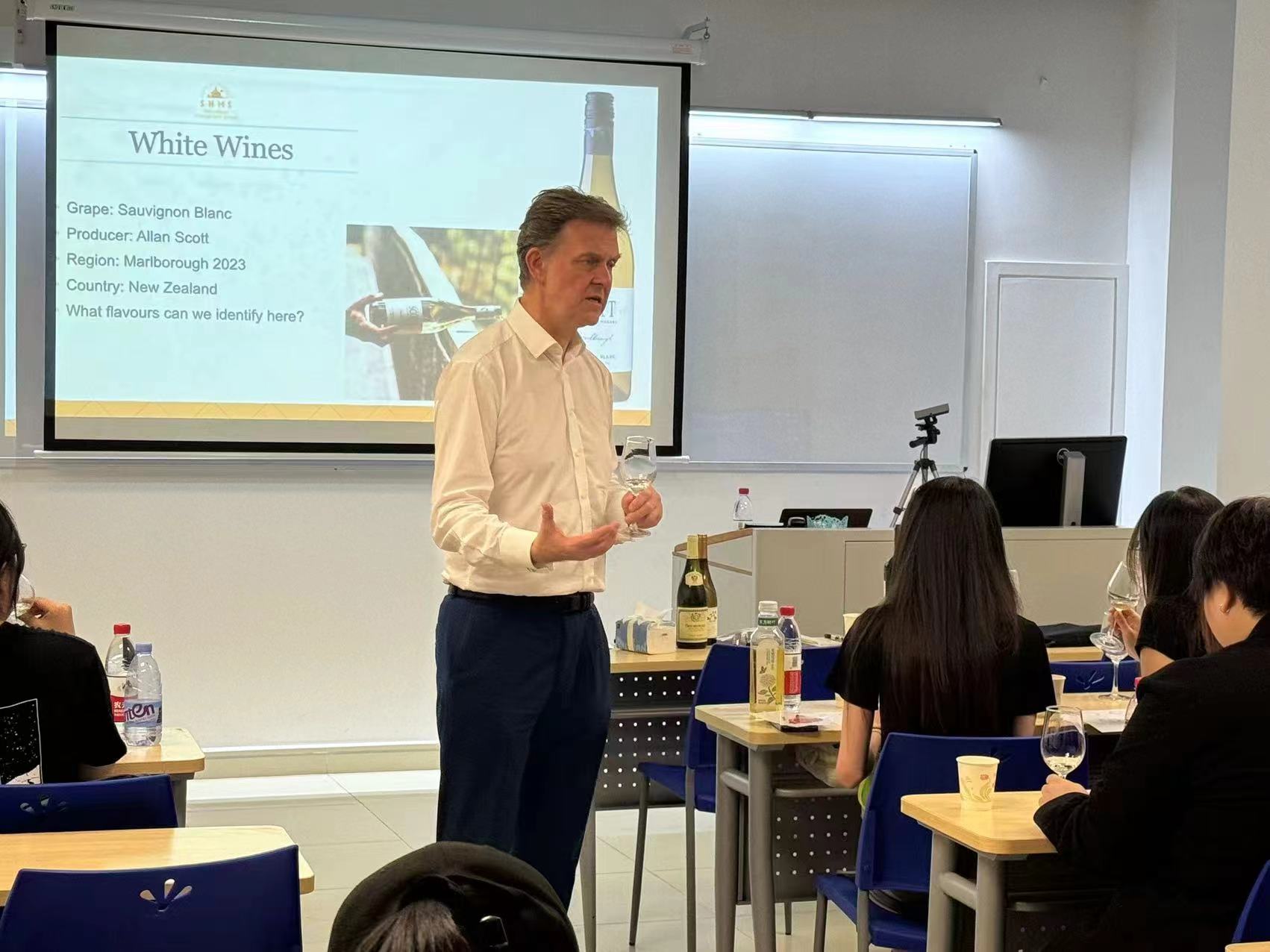 On the evening of 15 May, 2024, the Tourism, Hospitality, and Event Management Programme, allied with the SEG Swiss Education Group, invited Mr. Simon Thompson from the Swiss Hotel Management School (SHMS) for an immersive wine tasting introduction. This formed a part of Assistant Professor Dr. Zhang Liheng's Food and Beverage Management course, conducted in classroom CC302.