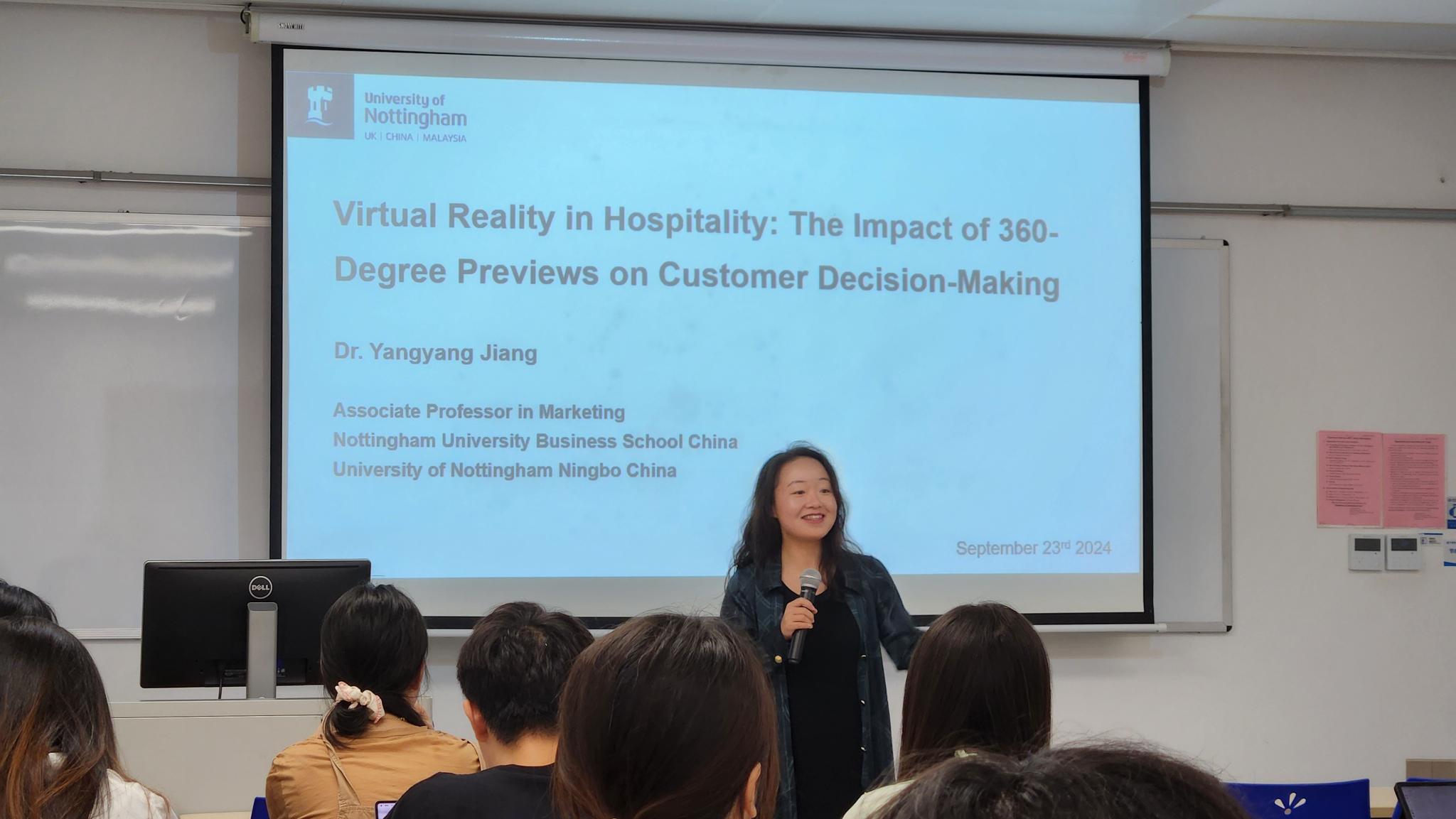On the afternoon of September 23, 2024, Tourism, Hospitality and Event Management Programme of the Department of Cultural Creativity and Design, School of Culture and Creativity invited Associate Professor Jiang Yangyang from the University of Nottingham Ningbo China to give a compelling seminar titled " Virtual Reality in Hospitality: The Impact of 360 Degree Previews on Customer Decision Making " in classroom CC-302.