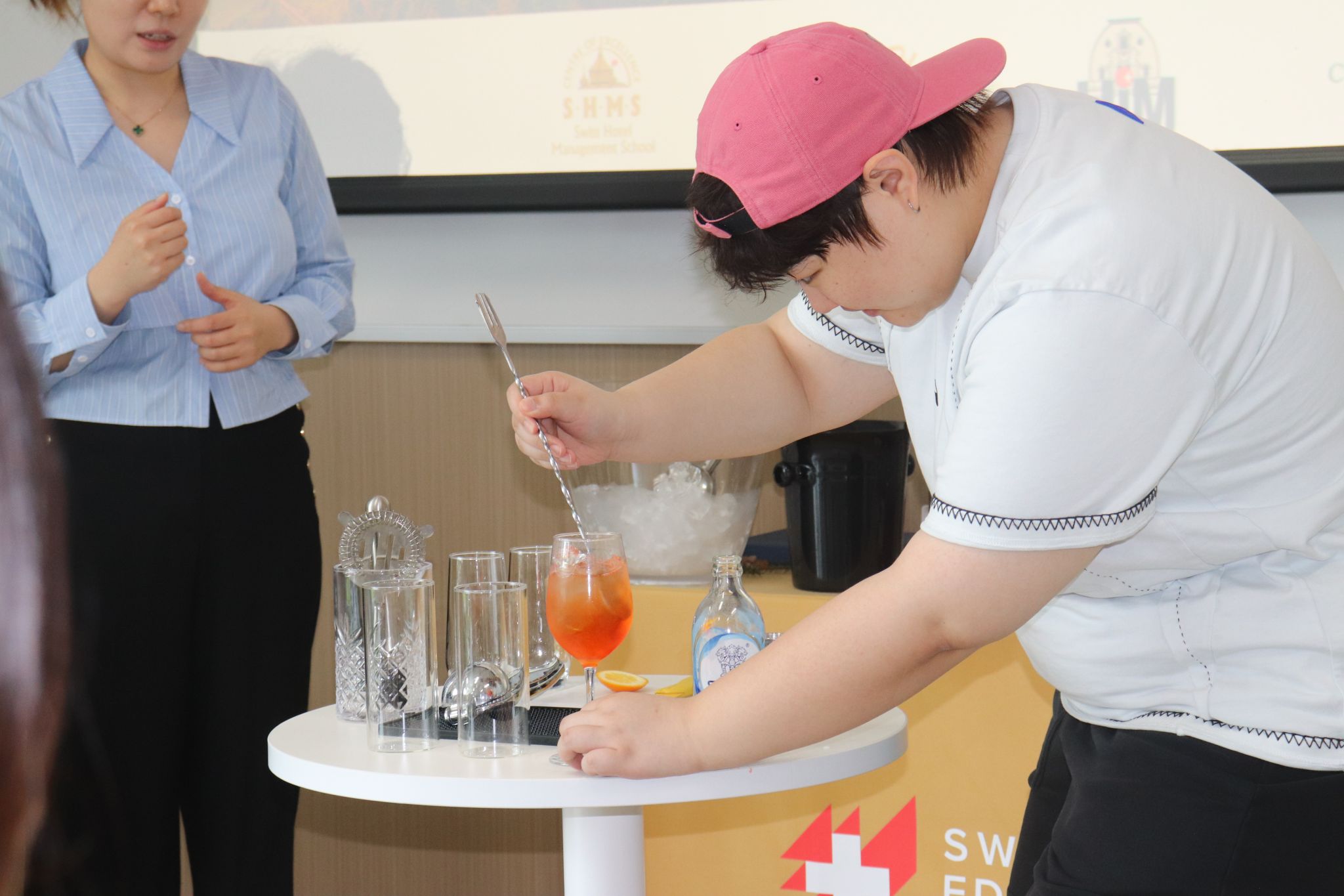 The culminating session on April 23 featured an immersive mixology experience. Ms. Rita Wang demonstrated essential bartending techniques, including shaker and mixing glass usage, ice handling, and straight-pour methods. Under her guidance, students practiced blending, building, and shaking techniques to create classic cocktails like Martinis, Daiquiris, and Rainbow shots, gaining hands-on appreciation for the art of mixology.