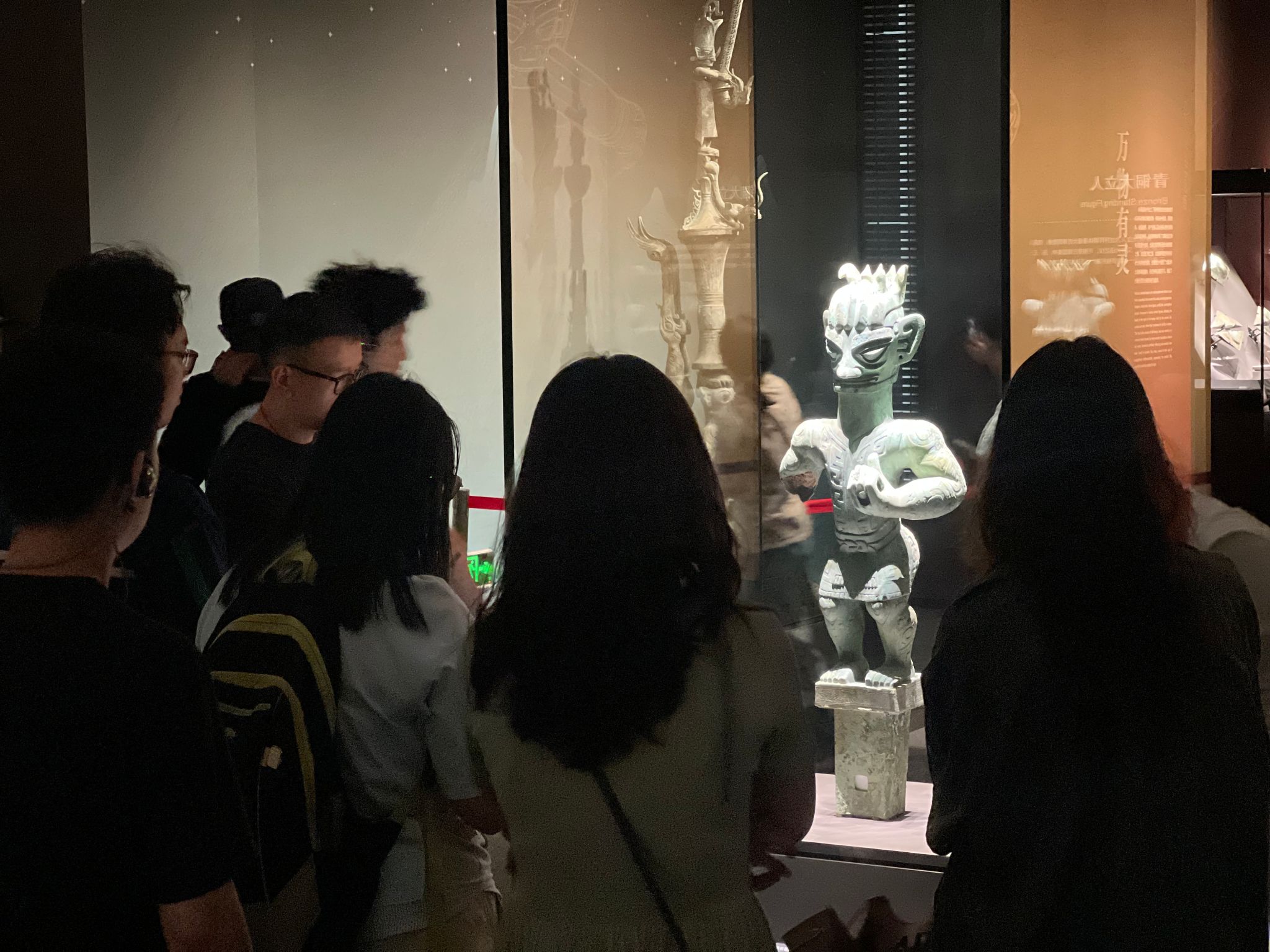 The field study commenced at Hengqin's Sanxingdui Exhibition. During an hour-long guided tour and artifact observation session, students explored the distinctive allure of ancient Shu civilization. They particularly examined exhibition design principles, visitor engagement strategies, cultural product development, and special exhibition management, sparking vibrant professional discussions.