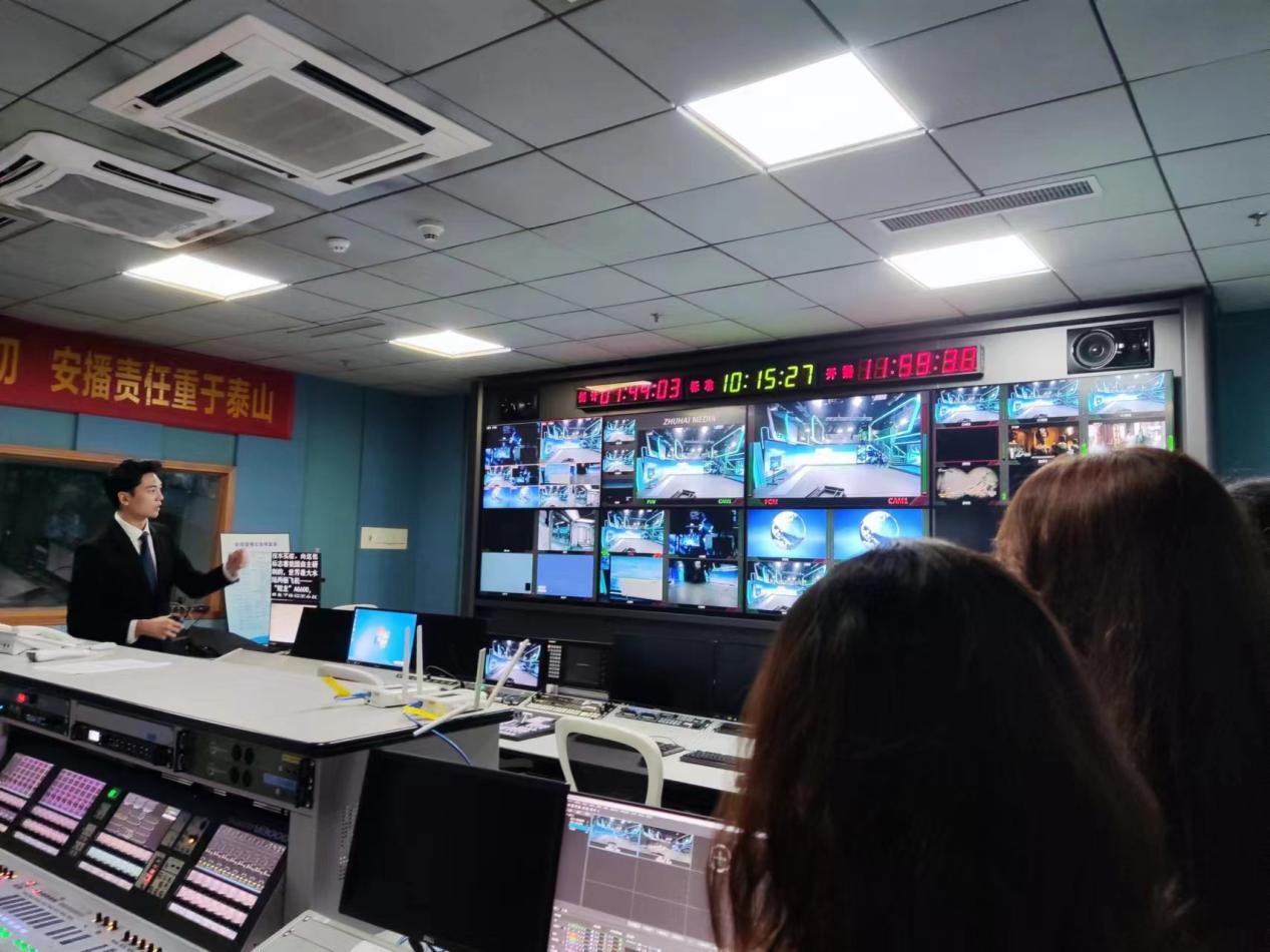 在主持人的带领下,同学们先通过短片对珠海传媒集团融媒体中心有了一定的了解,接下来又先后参观了“九霄”融媒体生态系统、演播厅以及导播室。