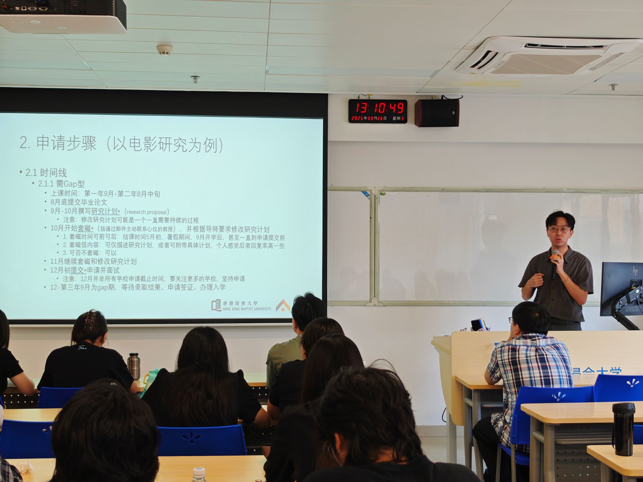 9月26日,授课型研究生课程——影视与新媒体制片管理专修成功举办了一场博士申请经验分享讲座。我们特别邀请到来自香港浸会大学电影学院的陈树豪与梁家俊两位博士生学长,围绕“博士申请流程”与“研究计划撰写技巧”两大主题,为有意继续深造的同学们带来了一场干货满满、生动实用的“申博攻略”指导。