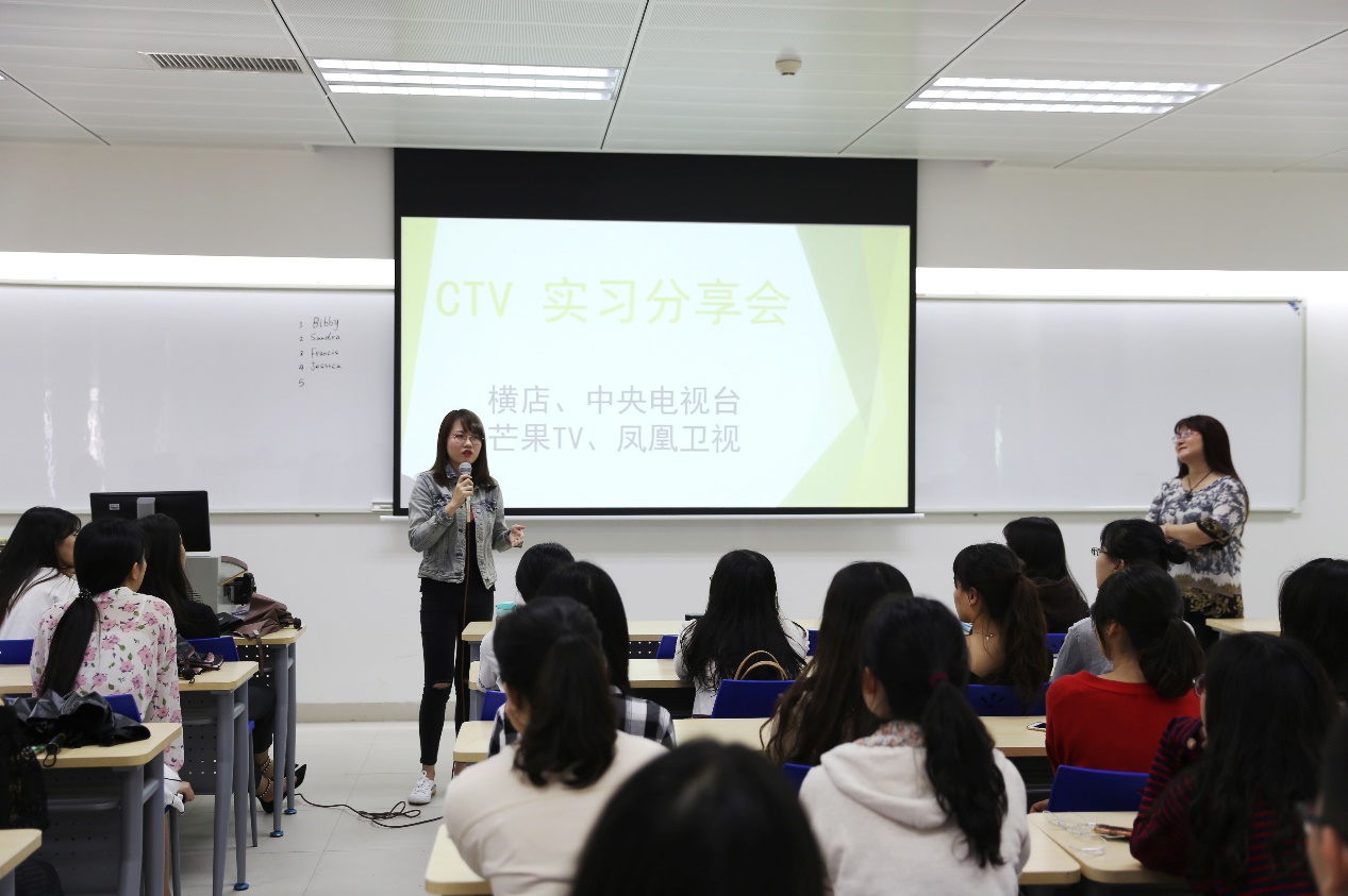 2017年11月1日下午,我校文化创意学部电影电视专业(DCC-CTV)实习分享会在T29-604举行,电影电视专业系主任麦莉娟教授、电影电视专业万多明教授、四年级的优秀实习生代表以及大二全体同学参加活动,活动由麦莉娟教授主持。
