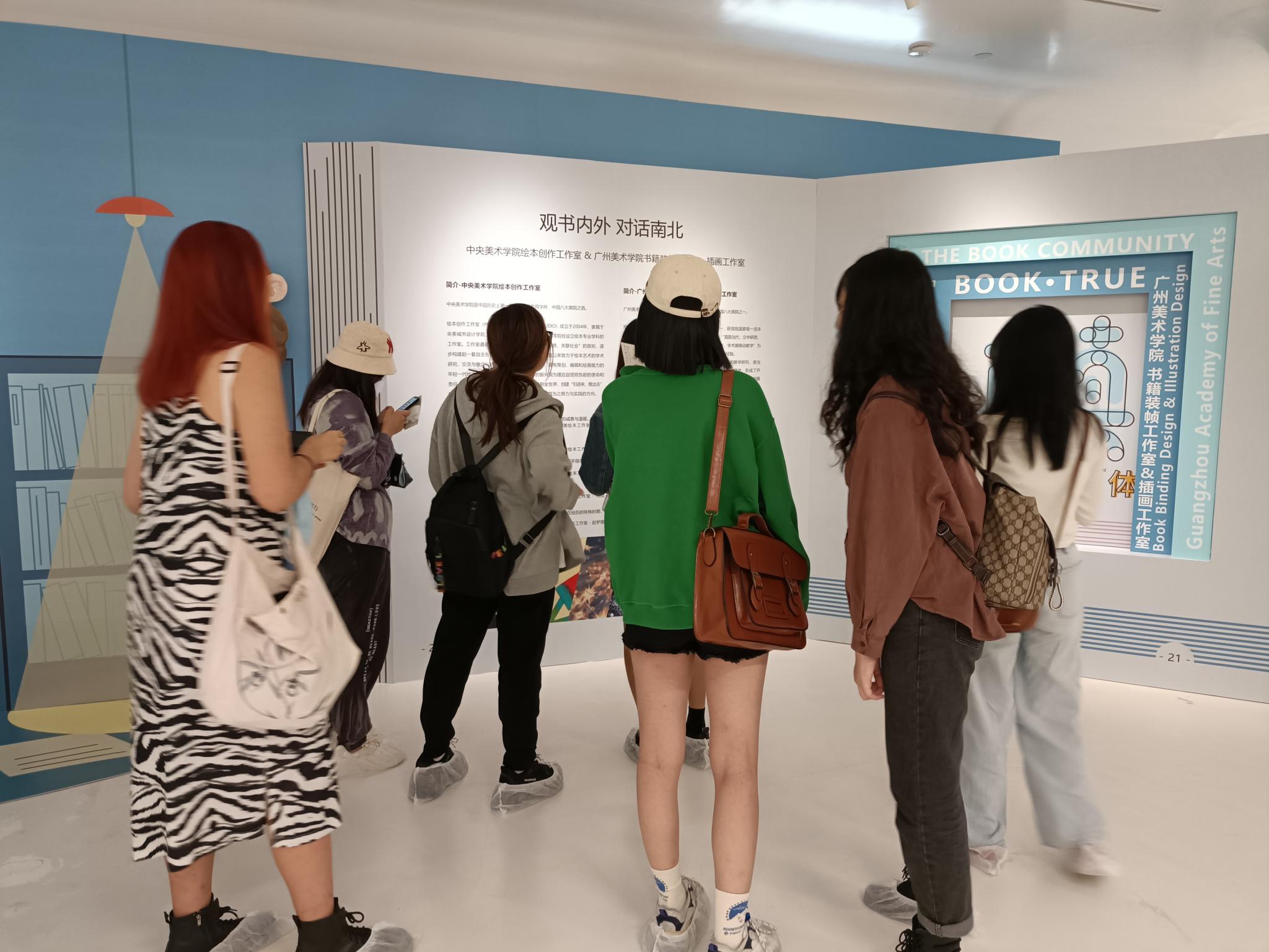 实地考察当天,美术馆正在进行主题展览《本 真:书籍共同体》。该展览是由中央美术学院绘本创作工作室与广州美术学院版画系书籍装帧工作室、插画工作室组织的优秀毕业设计双年展。同学们细细地欣赏和体会精美的插画艺术作品,沉浸在艺术的氛围中,度过了一下午的艺术时光。