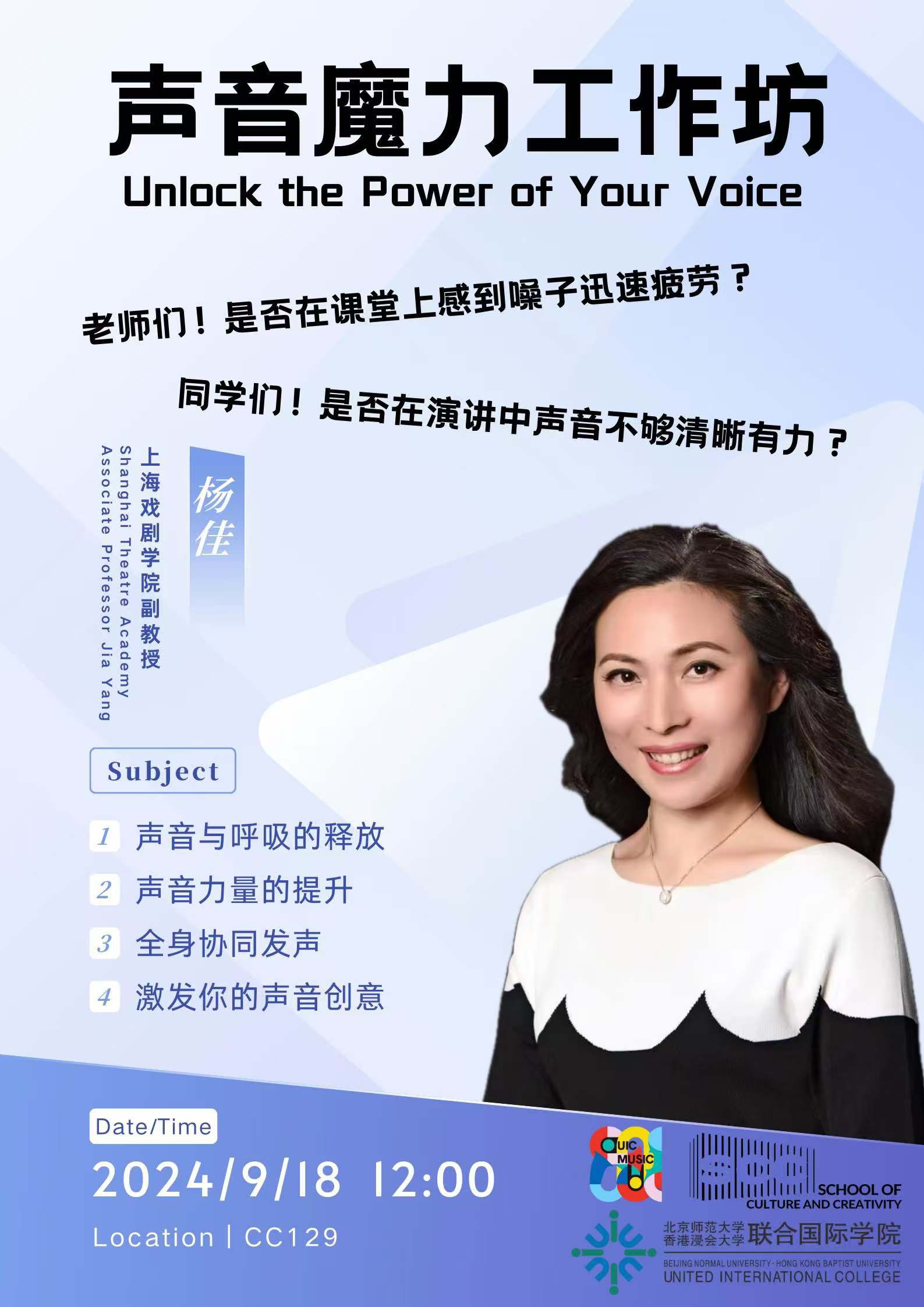 2024年9月18日中午,应文化创意学院音乐系特别邀请,上海戏剧学院硕士生导师杨佳副教授《声音魔力工作坊》讲座在文创学院CC129室成功举行。
