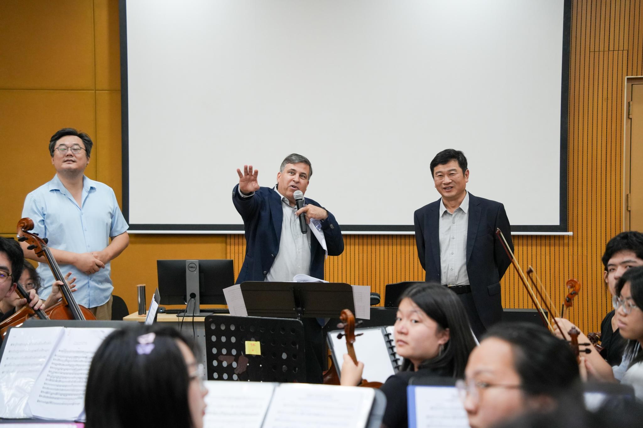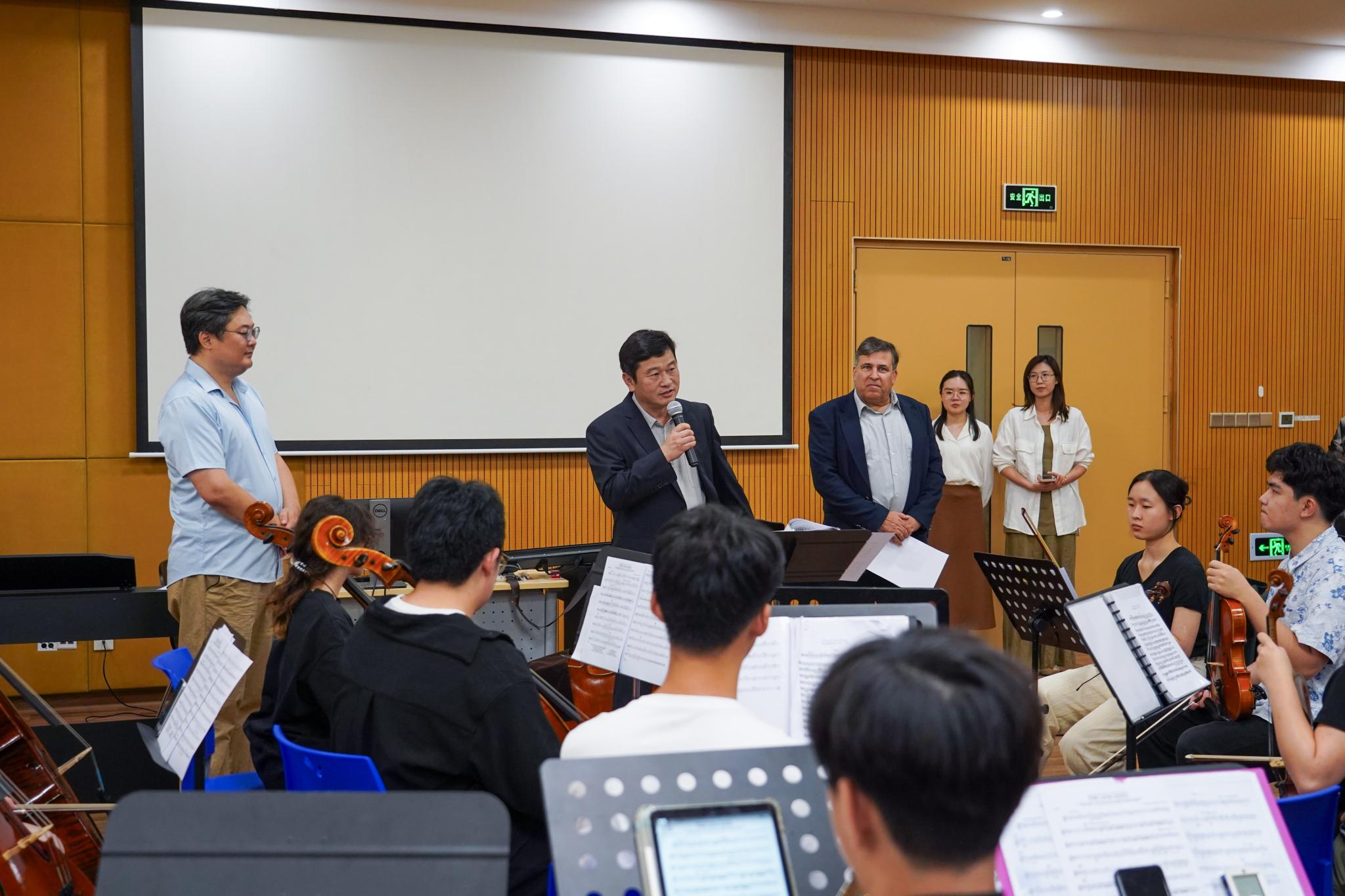 音乐系主任托马斯·亚历山大·斯坦教授以热情洋溢的开场辞为活动拉开序幕。他热烈欢迎陈校长的到来,并隆重介绍了为UIC管弦乐团发展作出卓越贡献的各位核心教师。斯坦教授同时分享了他对乐团的美好愿景,强调音乐系在培养学生音乐技巧与激发文化表达方面所做的不懈努力。他特别提到,UIC管弦乐团近年来不断成长,未来将拥有更多展现自我的机会与艺术成就。