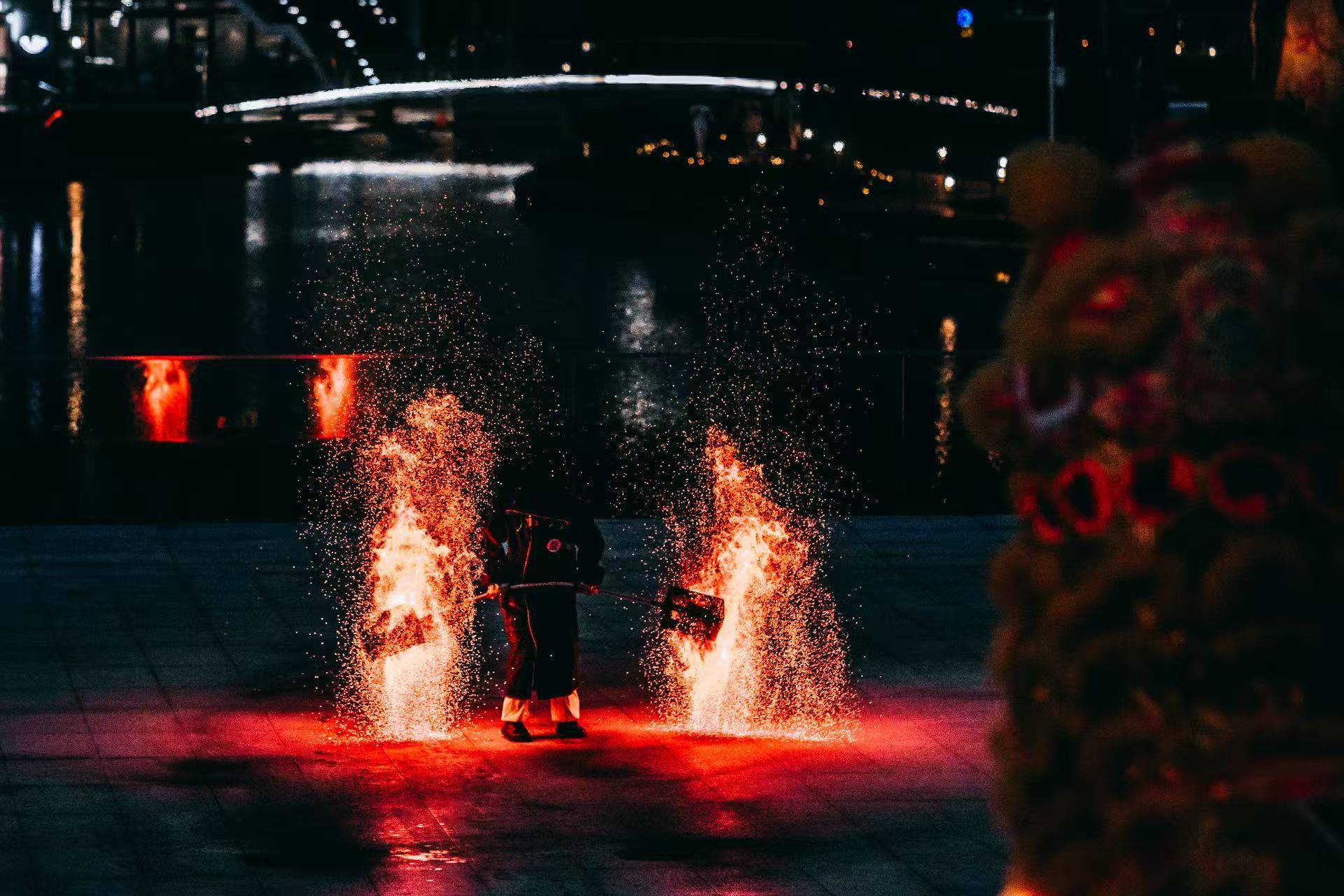 宾客在龙狮的引领下,来到薄水平台欣赏夜光龙狮与非遗火艺表演。夜幕降临,整片空场忽然被炸开的金红火星子点燃。紧接着,荧光舞龙舞狮登场,光影交织,彩光夺目。