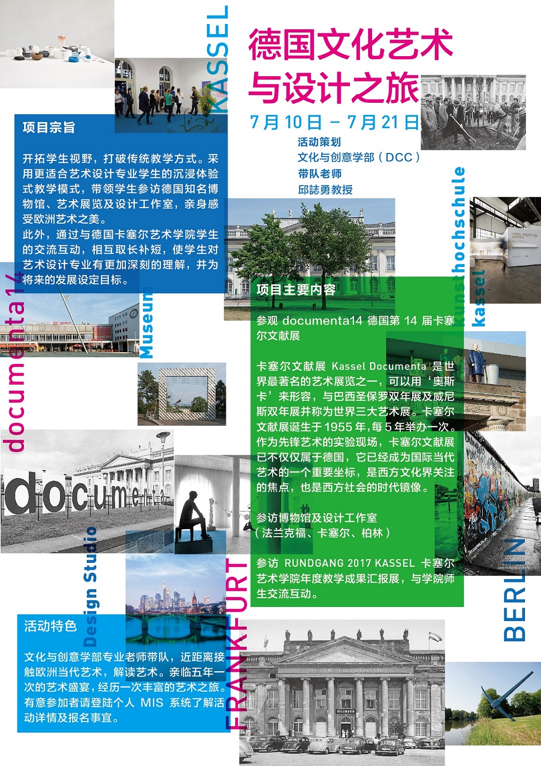 此项目由文化与创意学部媒体艺术与设计专业主任-邱志勇教授带队,旨在打破传 统教学方式,用沉浸体验式教学模式带领学生参访德国知名艺术博物馆、 世界著名艺术展及知名设计工作室,近距离接触欧洲当代艺术,在专业的引导下解读艺 术,亲临五年一次的世界艺术盛宴,经历一次丰富且难忘的艺术之旅。