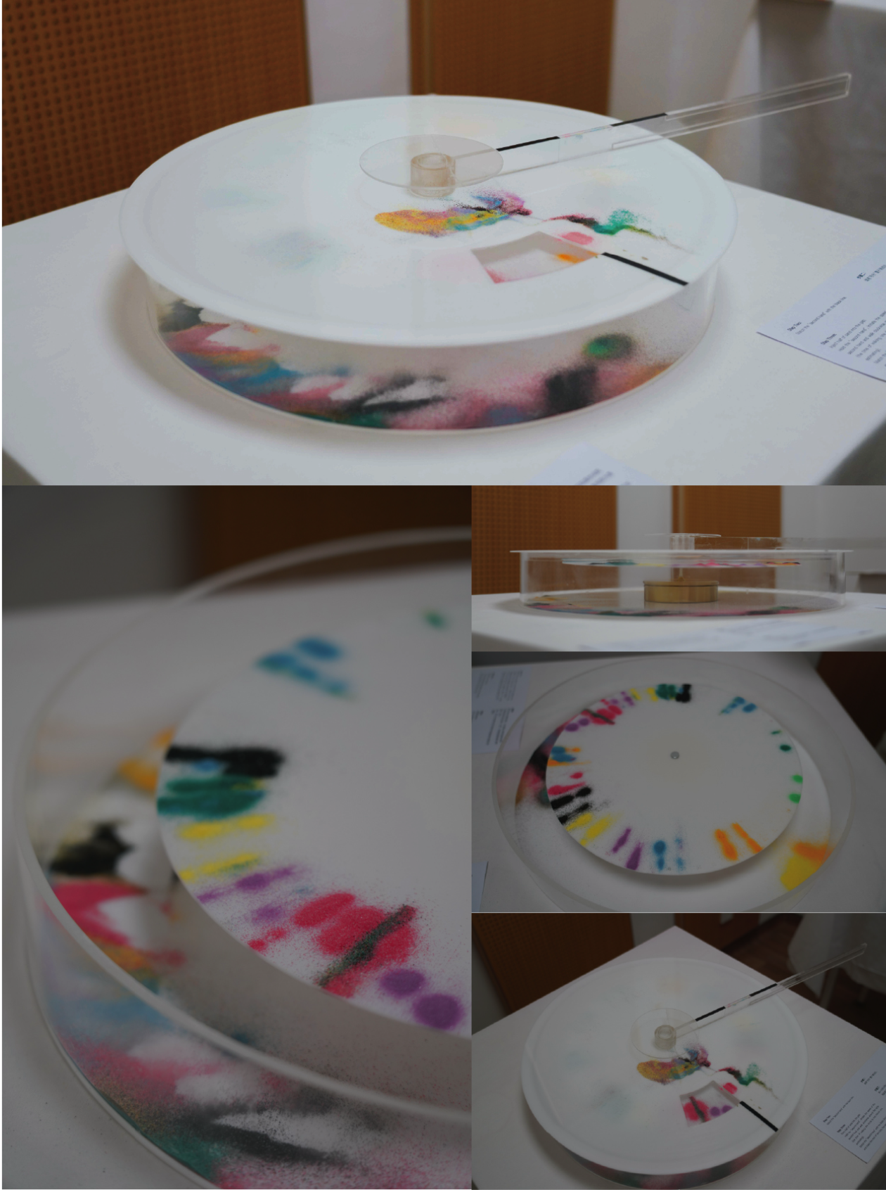 这是一件关于时间的艺术装置。整个装置主体分为两部分——内部代表客观时间自动转动的“分针转盘”和外部代表主观时间需要参与者自主转动的“模拟秒针”。对于内部来说,我们可以将整个圆盘看作一小时,而每一小格就是一分钟,整个圆盘的自主转动速度与分针一致,所以这部分可以视为客观时间。而对于外部而言,参与者控制“秒针”转动,让自己模拟秒针的运动速度与轨迹。以一圈作为一个单位,参与者对一分钟进行估计,分别在开始和结束两个时间点用沙漏中的沙在圆盘上进行标记,从而可以通过“秒针”在“分针转盘”上的标记直观的看到自己的主观 时间和客观时间是否吻合。另外,每个参与者都可以选择不同的沙子颜色用于标记,所以装置上会留下属于每个 人“一分钟”的独特印记。并且,参与者也可以带走自己用过的沙漏瓶子作为在此装置上留下属于自己“一分钟”的记忆。