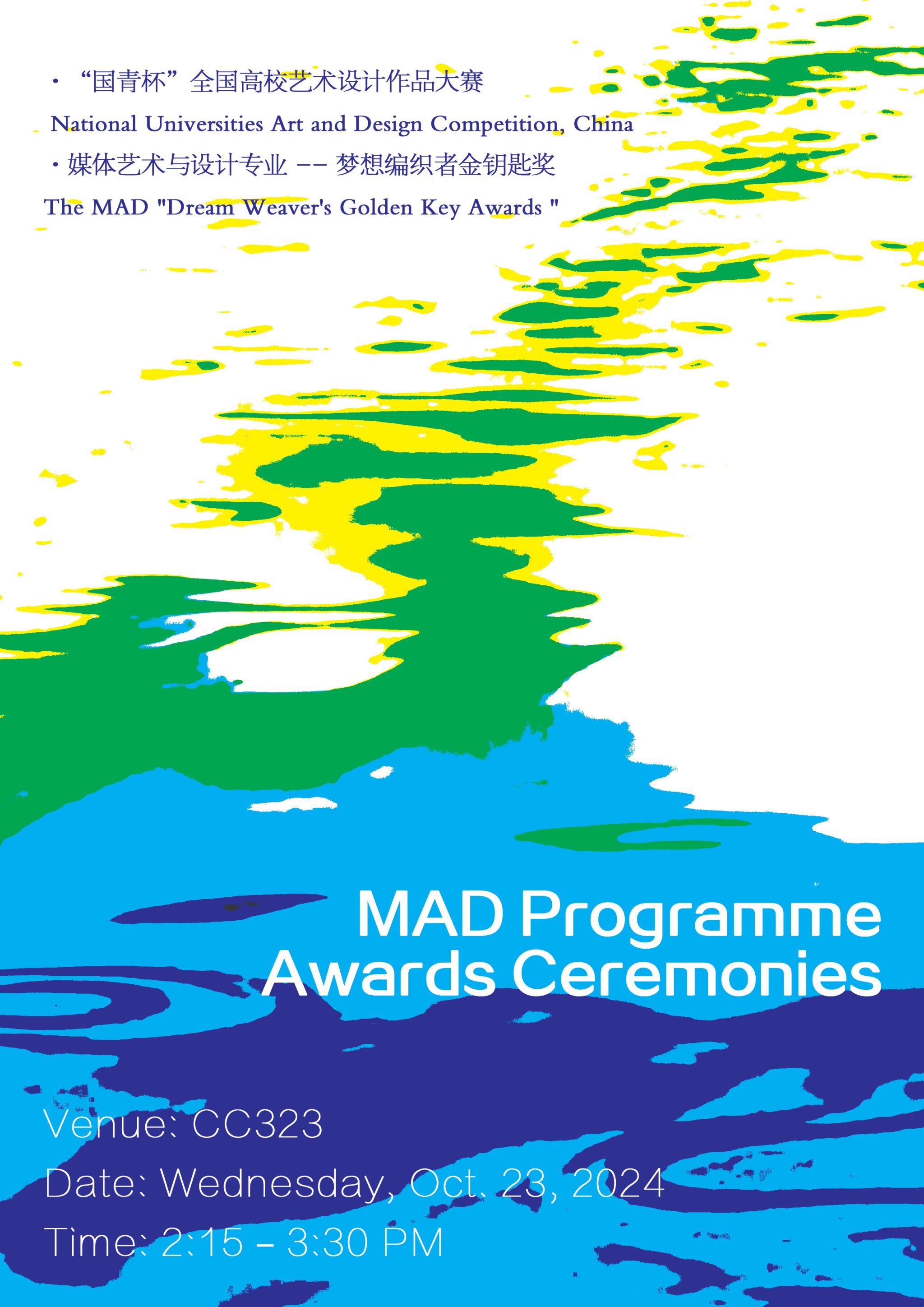 We are delighted to invite you to the Media Arts and Design Programme (MAD) Awards Ceremonies. This event will highlight the "National Universities Art and Design Competition"(“国青杯”全国高校艺术设计作品大赛) and the MAD "Dream Weaver's Golden Key Awards”(媒体艺术与设计专业——梦想编织者金钥匙奖). Please find the details below: