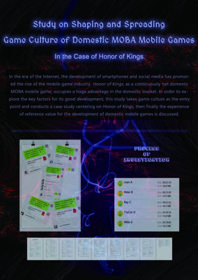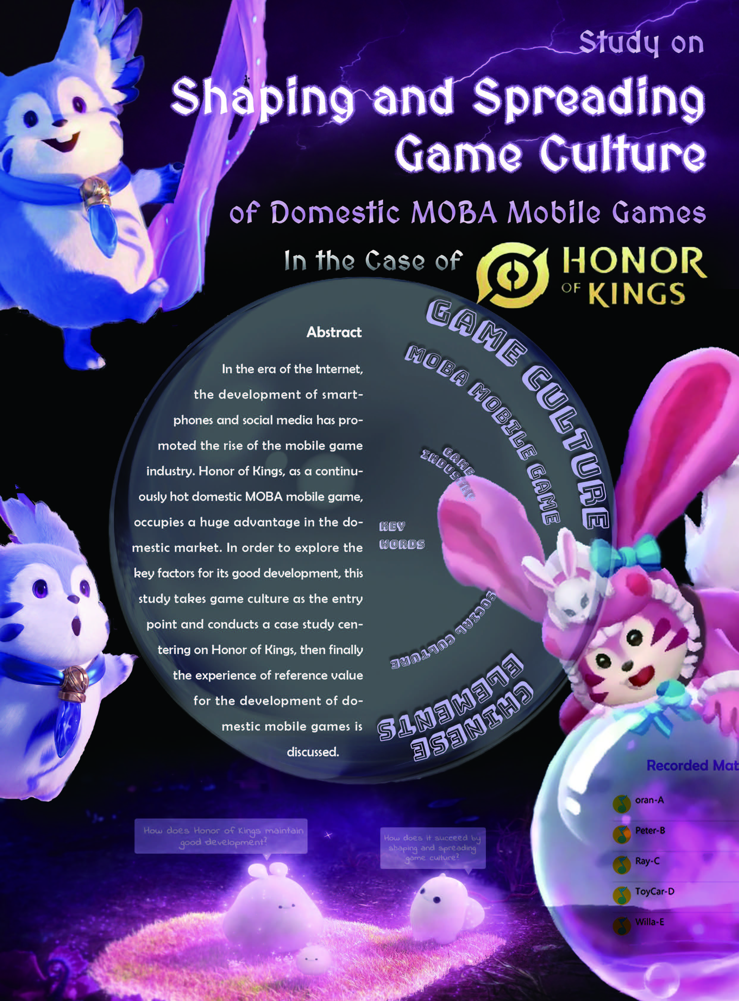 In the era of the Internet, the development of smartphones and social me- dia has promoted the rise of the mobile game industry. Honor of Kings, as a continuously hot domestic MOBA mobile game, occupies a huge advantage in the domestic market. In order to explore the key factors for its good development, this study takes game culture as the entry pointand conducts a case study centering on Honor of Kings, then finally theexperience of reference value for the development of domestic mobile games is discussed.