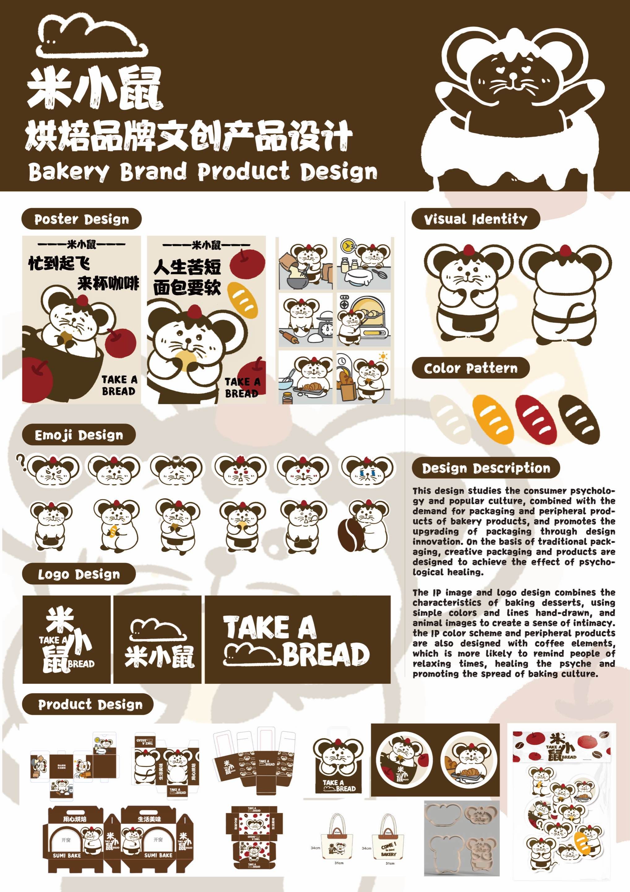 This desian combines the demand for packaging and peripheral products of bakery products,and promotes product upgrading through innovation, Adding creative packaging and periphera products based on popular culture and social consumption psychology, which can play the effect of psychological healing.