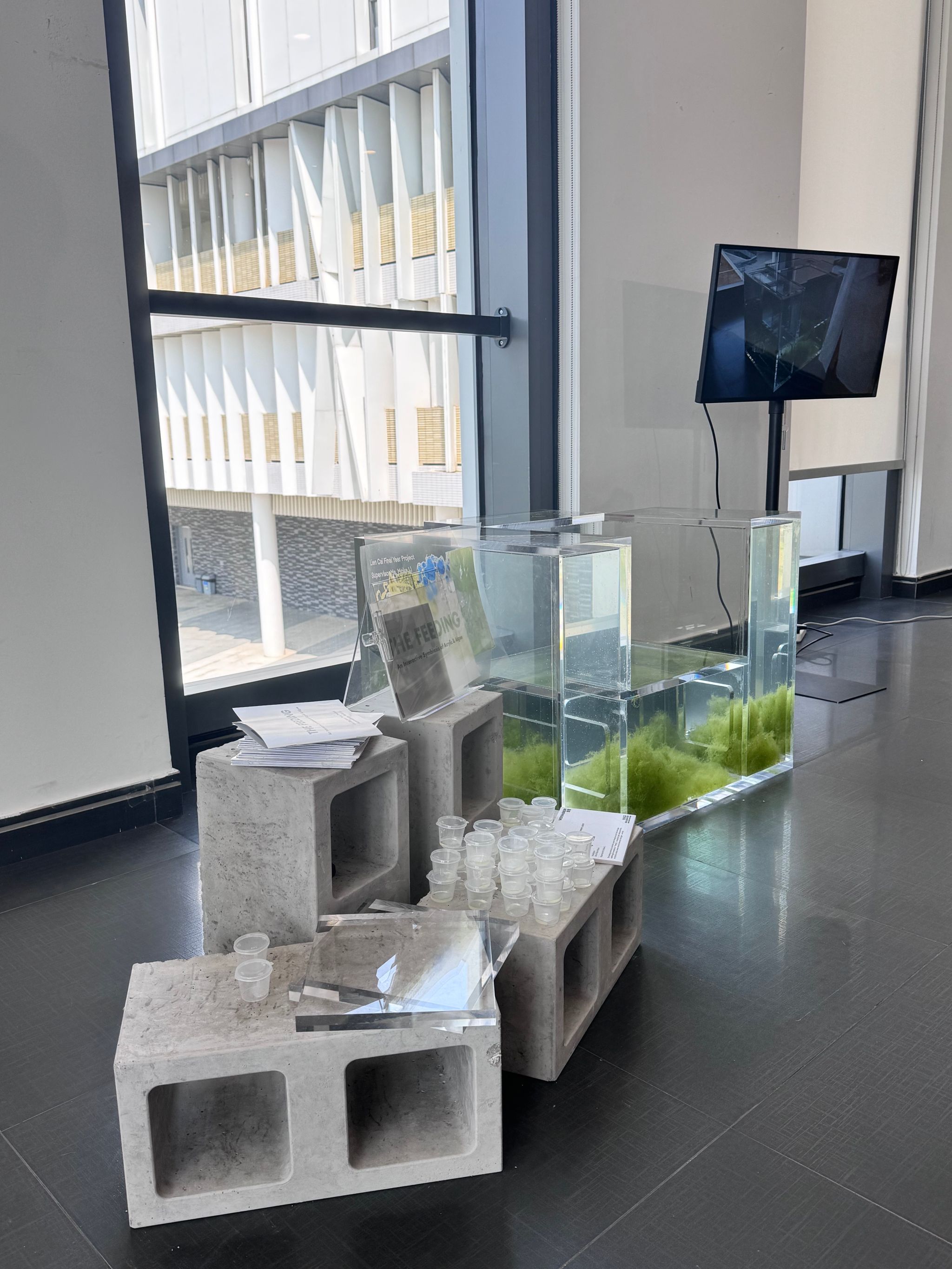 The Feeding constructs a symbiotic system through an acrylic sofa and algae, redefining the complexity of "feeding." By adjusting light, adding nutrients, or physical contact, viewers directly intervene in the algae's survival.