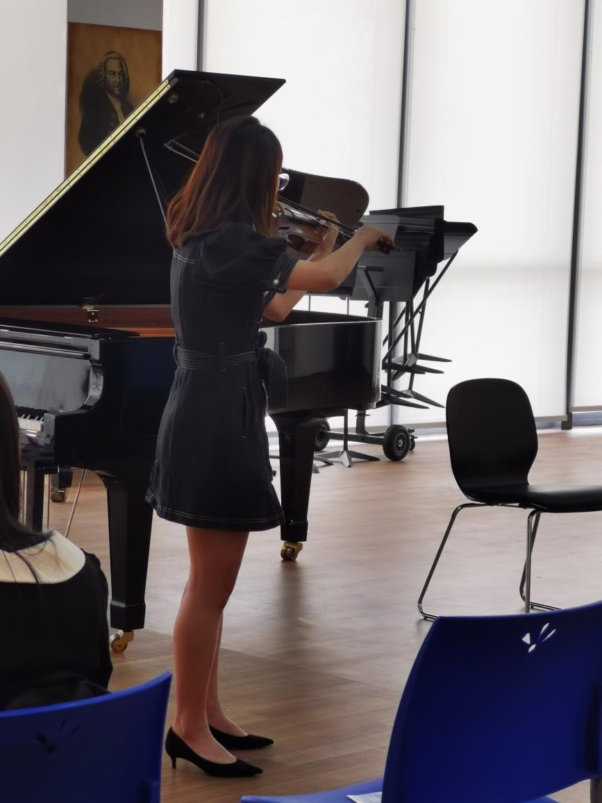 张淳懿的普罗科菲耶夫《D大调小提琴无伴奏奏鸣曲》,这部作品与普罗科菲耶夫的其他作品不同,同时具有独奏和合奏性质的一首奏鸣曲,也是普罗科菲耶夫小提琴曲目中演奏或录制最少的作品。同时这部作品也是他晚期创作风格的典范,张同学的演奏清楚地反映了普罗科菲耶夫后期追求更直接、更简单的音乐语言的创作风格,这首精巧的无伴奏奏鸣曲技巧性非常突出的同时,旋律走向又具有典型的俄罗斯舞曲风格特点,让大家对于小提琴演奏技法有了进一步的认识。