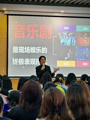 2023年10月20日,音乐系组织举办的音乐剧大师李盾教授讲座活动在CC-129报告厅举行。中国原创音乐剧著名制作人、被称为“ 中国音乐剧教父” 的李盾先生应邀作了题为《人生第一步就要对》的演讲,讲座内容包括:音乐剧的艺术特点与表现形式,当代中国音乐剧的现状与趋势,以及音乐剧如何引领音乐审美教育的独到见解。李盾教授还通过自身经历阐述了人生道路选择与规划的重要性,讲座中还进行了音乐系师生现场演唱李盾教授最著名音乐剧“ 蝶” 中歌曲的互动环节,以及最后的提问环节,讲座历时一个半小时圆满结束。