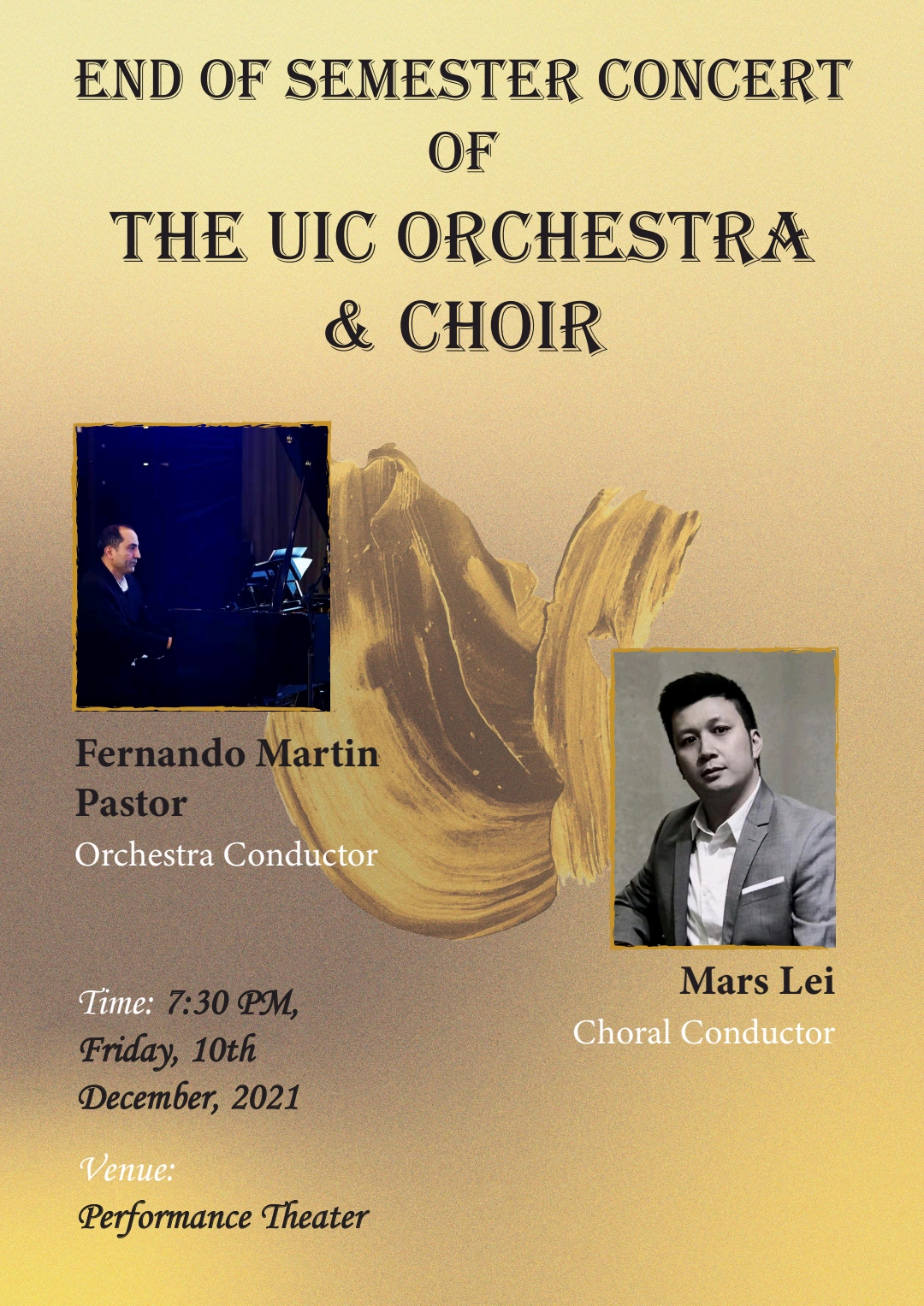The concert will be performed by the UIC Orchestra and Choir. With two conductors and students' efforts, the orchestra and choir will give a wonderful performance for you. We hope our music can heal you in this cold night, please join us to witness a wonderful artistic feast.