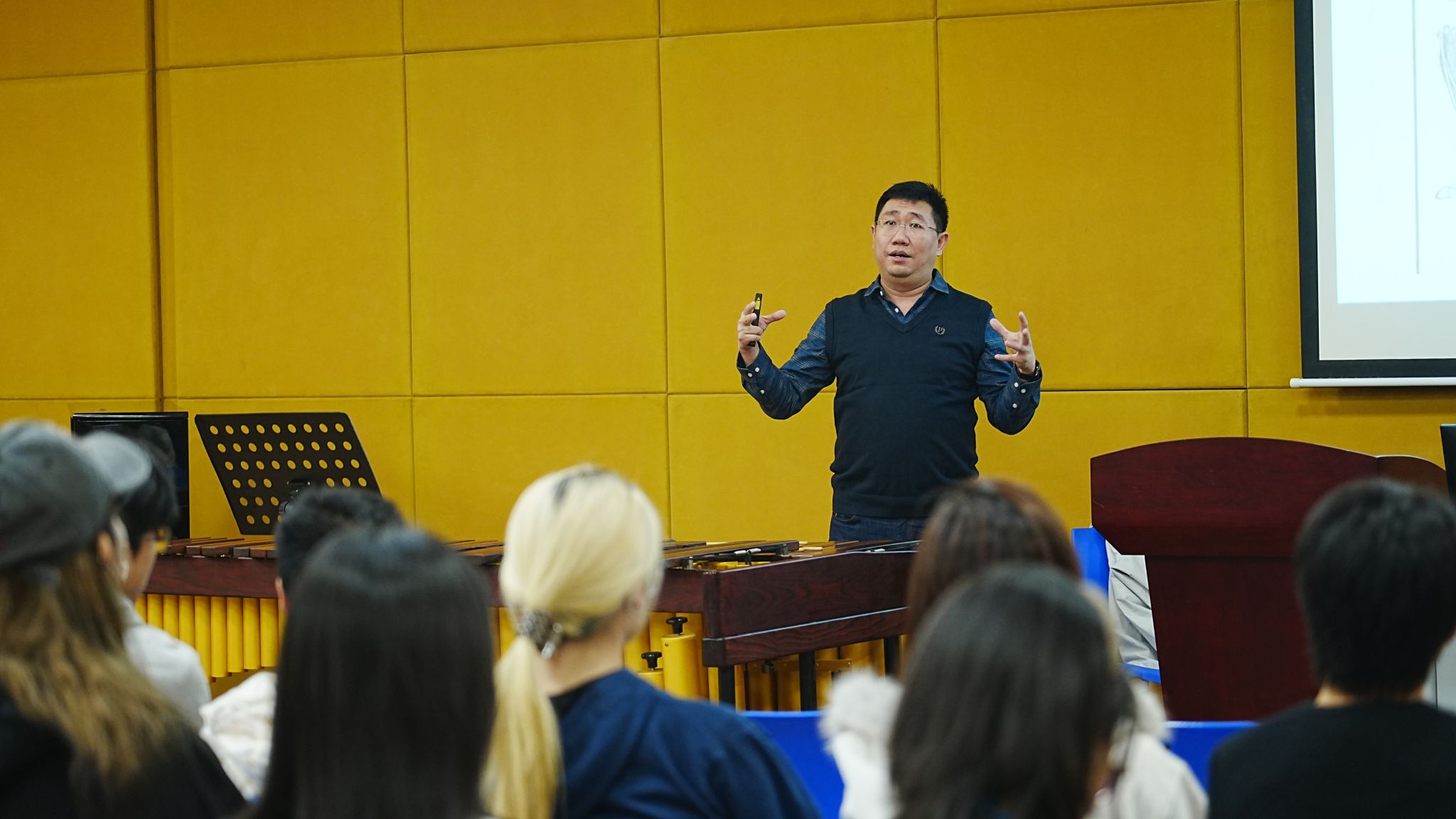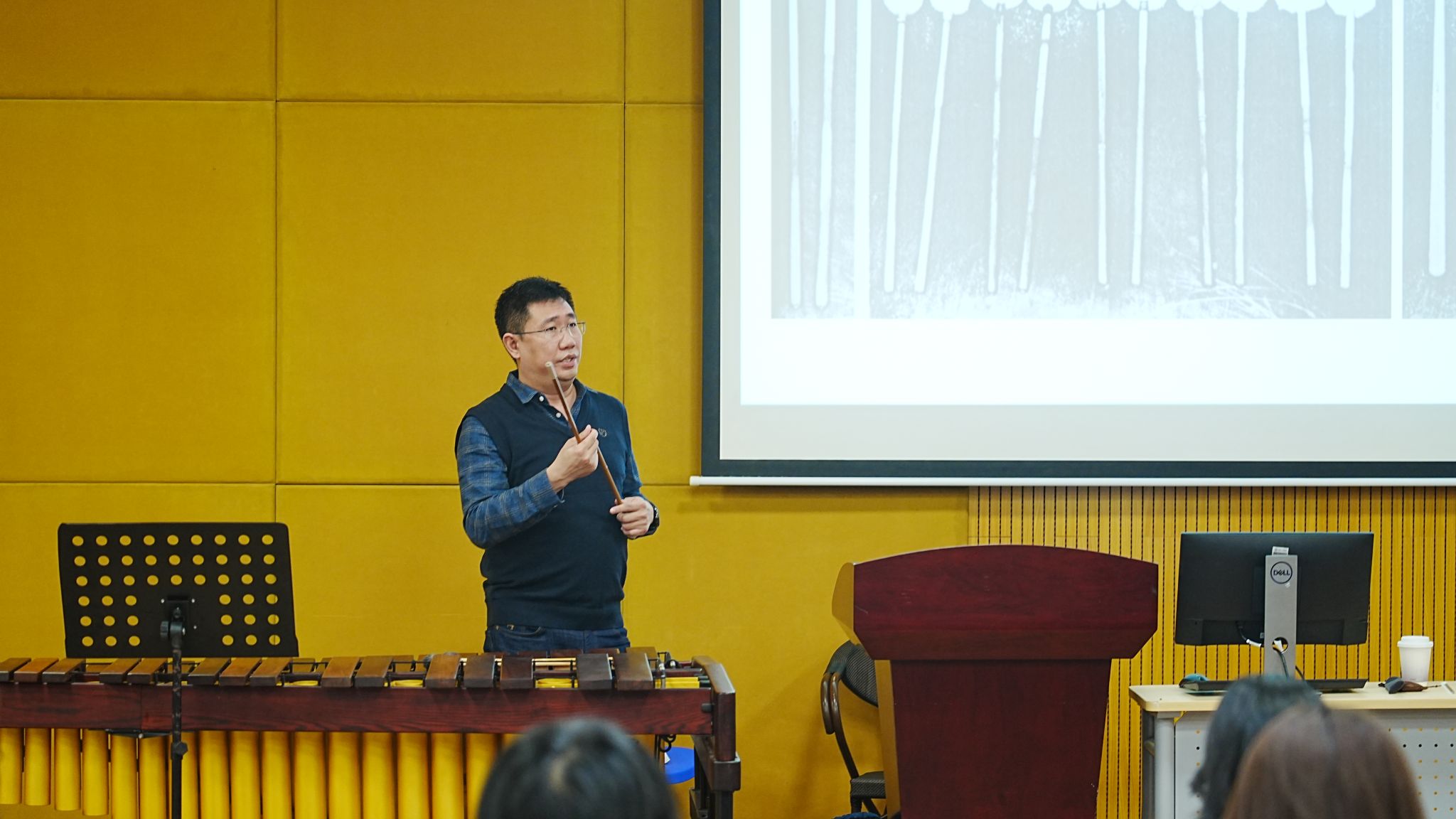 在完成《走进打击乐家族》主题分享后,王老师还面向音乐系马林巴专业的学生开展了一对一指导环节。围绕学生的演奏情况,他进行了针对性的示范与讲解,结合具体作品,就演奏动作、音色控制及音乐表达等方面进行现场指导,使学生得以在实践中进一步理解相关技术要点。本次《走进打击乐家族》大师班通过集中讲解、实例展示与针对性教学相结合的方式,呈现了打击乐器在音乐实践中的多层面内容,也为音乐系持续推进专业交流与教学活动积累了经验。