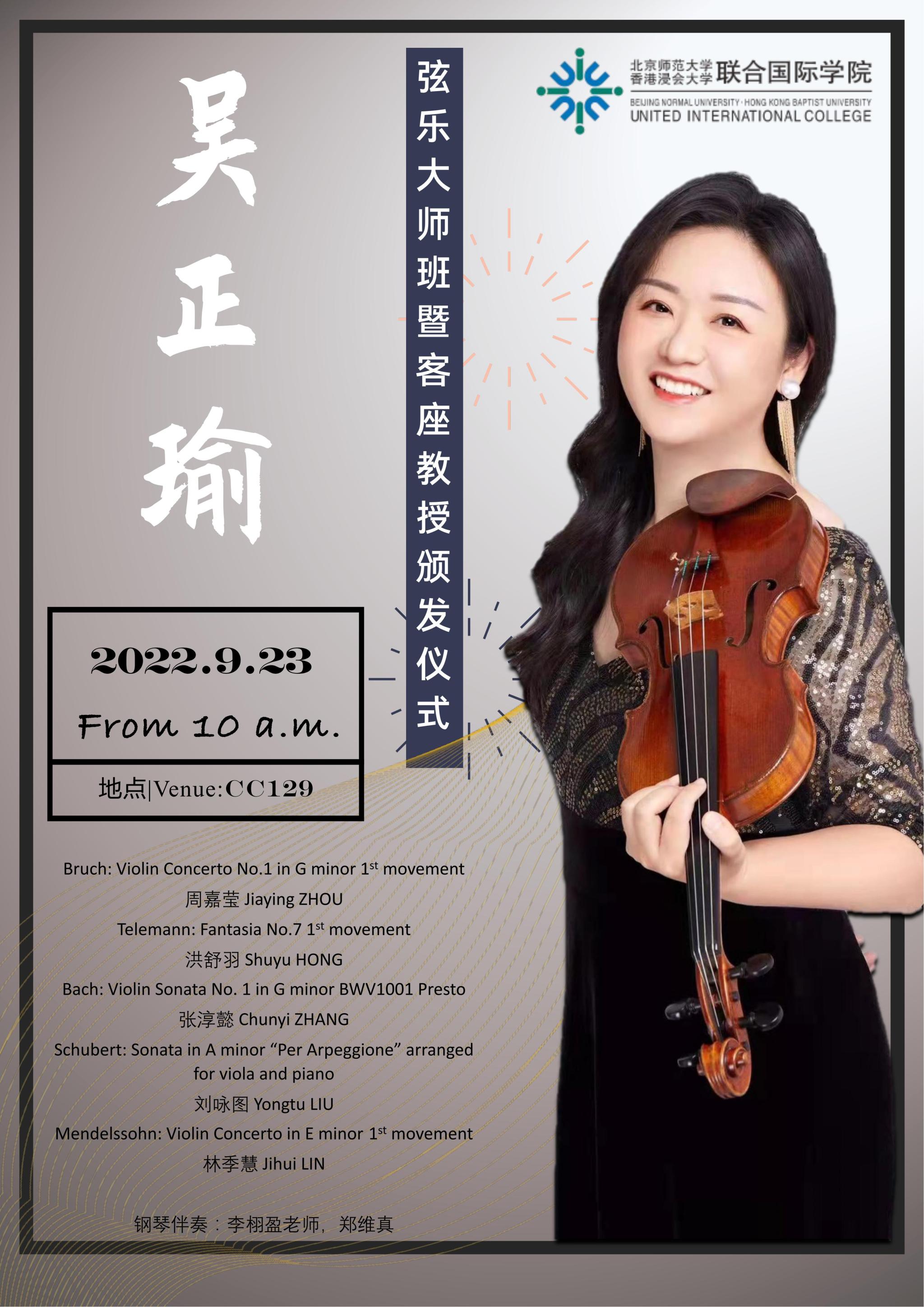 Bio of the Speaker: Learning from Zhonghua SHENG,  Jiyang ZHAO,  Zhinuo DING, Ivry Gitlis, Zakhar Bron. Ms.Zhengyu WU is former concertmaster of the Shanghai Philharmonic Orchestra and former Guest Concertmaster of the BBC Philharmonic Orchestra (2010). Bachelor's degree of Shanghai Conservatory of Music, winner of Golden Bell Award, winner of Fu Chengxian Scholarship. Master's degree of the Royal Northern Conservatory of Music, Winner of the Royal College of Music Joint Board A and other full scholarship recipients for two consecutive years.
