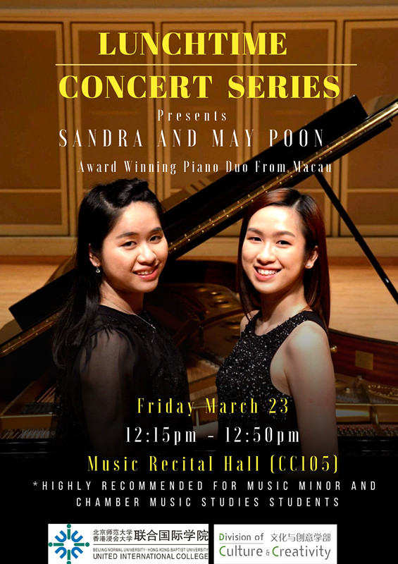 To launch the Lunchtime Concert Series for this Spring semester we are delighted to be able to welcome an Award Winning Piano Duo from Macau. The performers consist of Sandra and May Poon, who have played in the Macau International Music Festival, Prague International Piano Institute, International Keyboard Institute & Festival and the John Cage Centennial Festival, and are currently teaching at the Macao Conservatory School of Music. The concert will start at 12.15pm this Friday (23 March) in the Music Recital Hall (CC105). We very much hope you are able to join us for this special lunchtime performance. The Lunchtime Concert Series is organised by students of the Music Minor programme in the Division of Culture and Creativity.