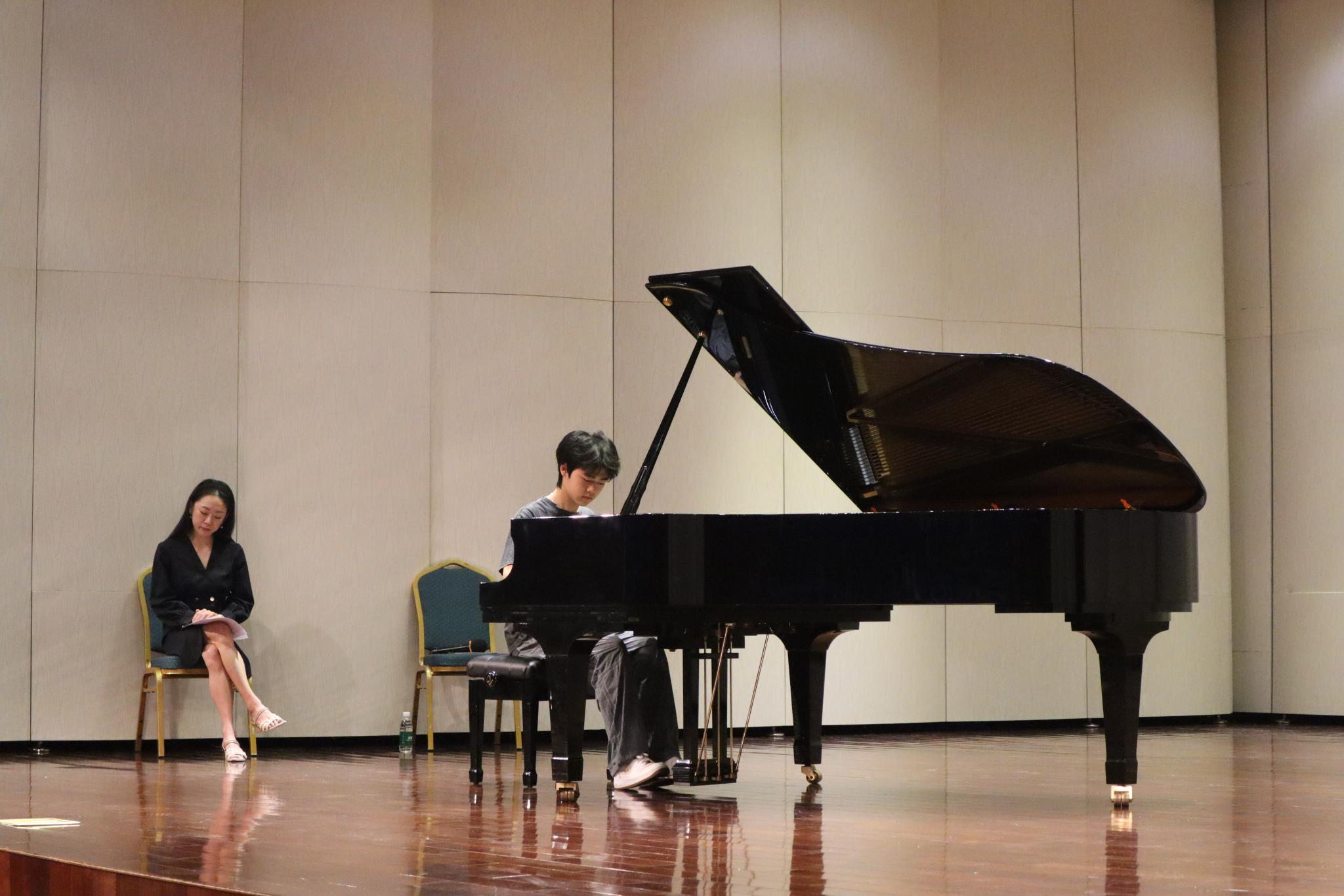 Caption: Dr. Yoonie Han attentively listens to a student’s performance, offering focused and precise guidance.
