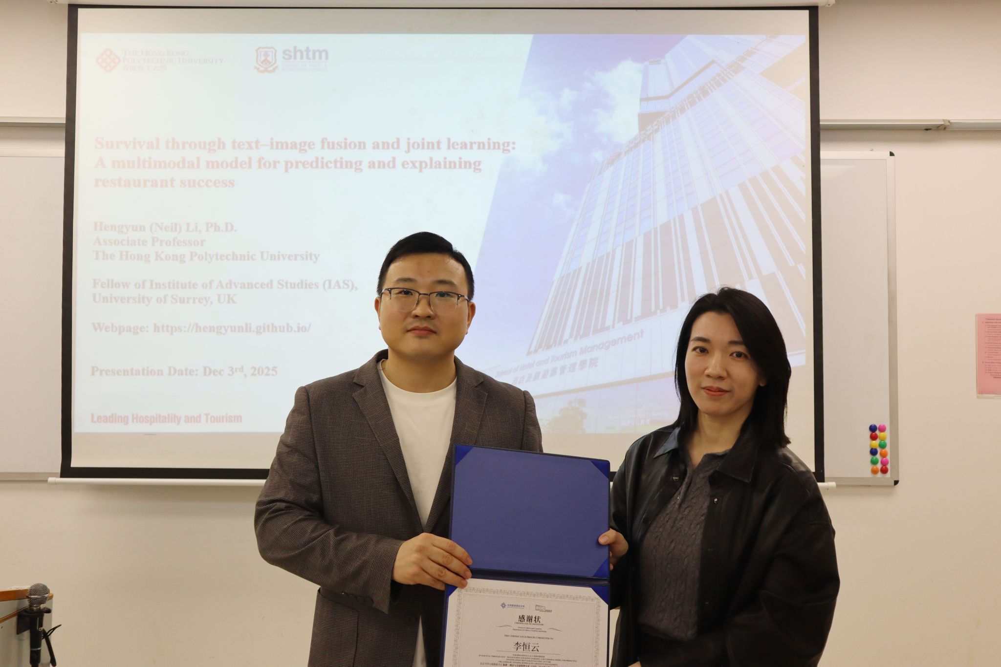 2025年12月3日,旅游、酒店与会展管理专业(THEM)荣幸邀请到香港理工大学酒店及旅游业管理学院副教授李恒云博士,在CC302教室带来了一场题为 “基于图文融合与联合学习的生存分析:揭示餐厅成败的多模态预测与归因模型” 的学术讲座。
