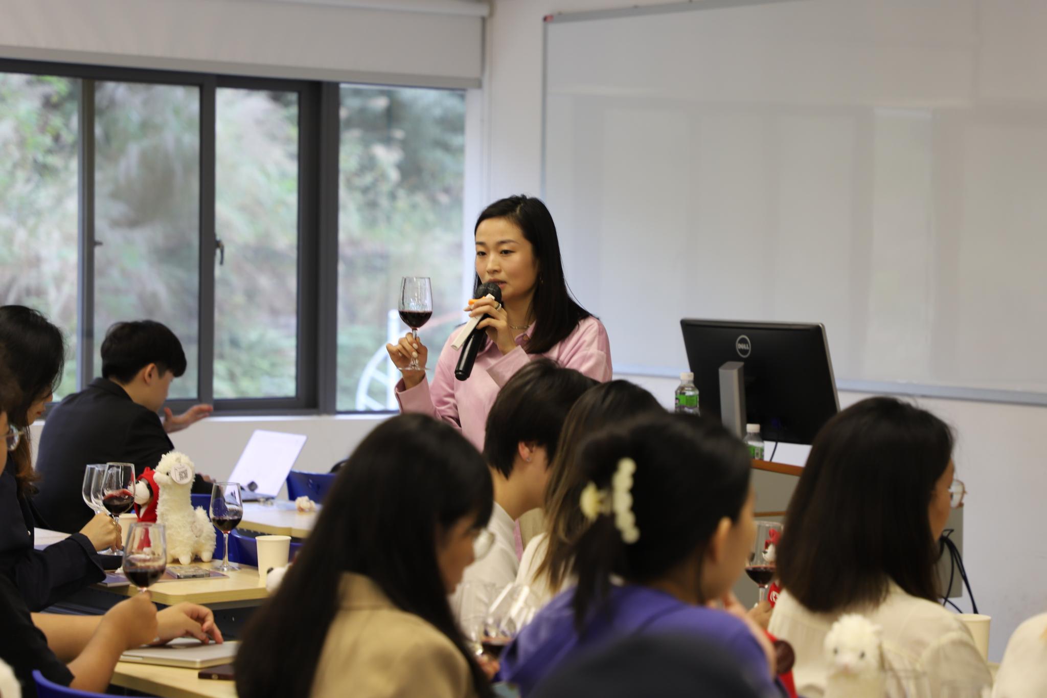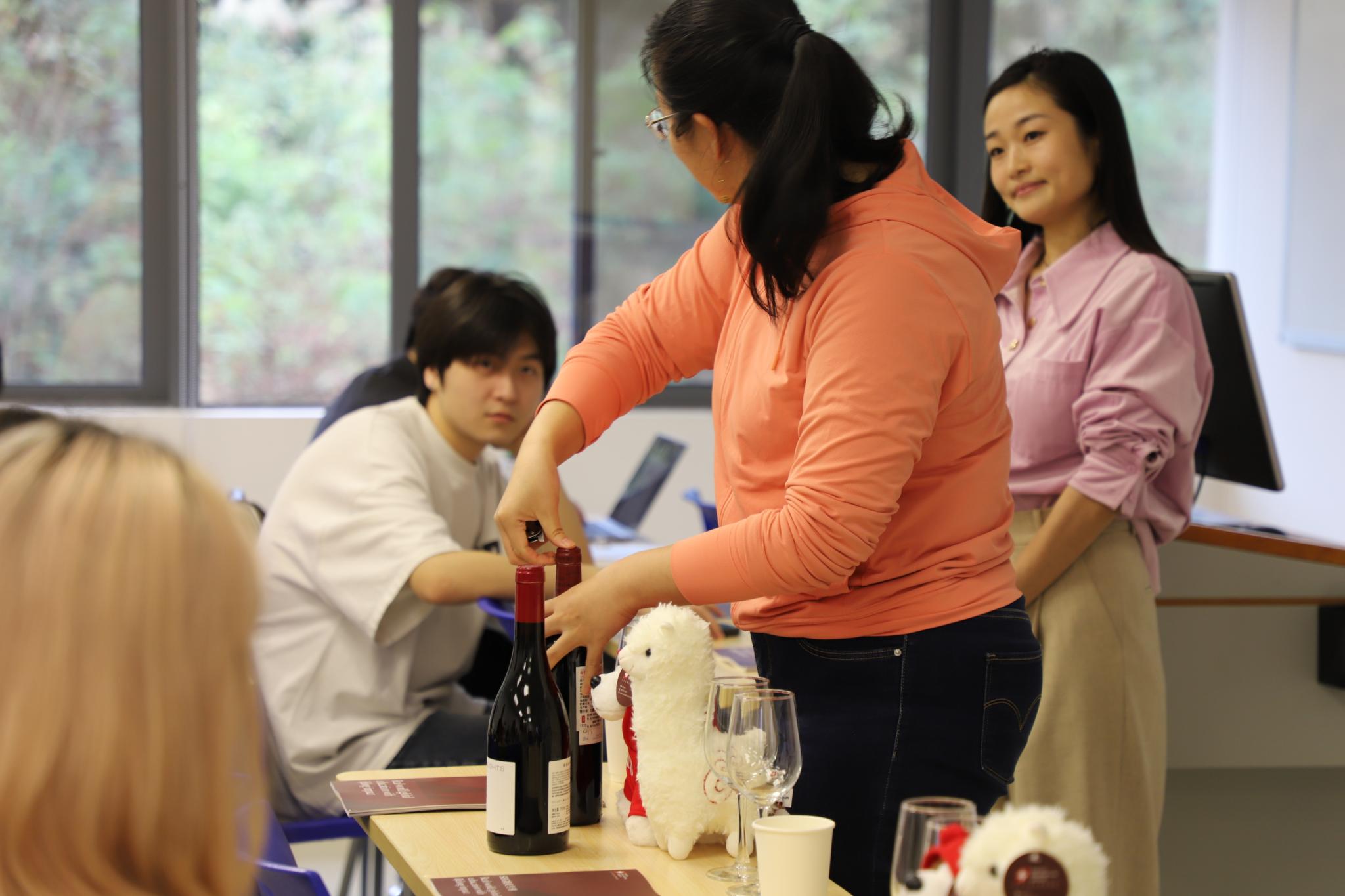 The event was divided into three parts: a wine tasting class, an alumni exchange and a Swiss Buffet. For the first part, Teresa started with introducing wine making, guiding the students to understand the materials and production of wine. For the later tasting, Professor Liheng Zhang tried to open the wine himself and Teresa demonstrated the teaching of wine opening and professional wine serving etiquette.